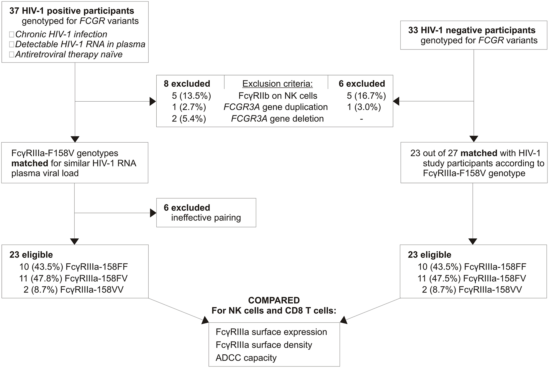 Thirty-seven chronic HIV-1 infected, viraemic, and antiretroviral naïve individuals with sufficient sample available were identified from an existing cohort of HIV-1 positive individuals (Figure 2). Following FCGR genotyping, seven individuals were excluded due to the possession of an FCGR3A gene duplication (n = 1), FCGR3A gene deletion (n = 2), or CNR1 deletion that results in the expression of the inhibitory FcγRIIb on NK cells (n = 4). To ensure that individuals carrying an undetectable CNR1 deletion—possess a duplication of this region on a single chromosome and a deletion on the other—were also excluded, expression of FcγRIIb on NK cells was monitored using flow cytometry. During the eligibility screening of individuals, such an individual was indeed identified and excluded from the study; thus, five HIV-1 positive individuals in total expressed FcγRIIb on their NK cells and were excluded.