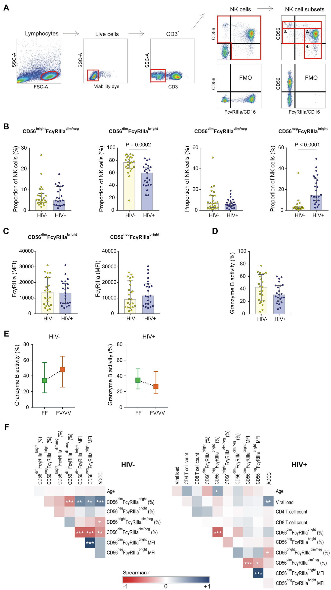 FcγRIIIa expression on NK cell subsets in HIV-1 uninfected and HIV-1 infected individuals matched for FCGR genetic variants. (A) Gating strategy for defining four NK cell subsets: 1. CD56brightFcγRIIIadim/neg, 2. CD56dimFcγRIIIabright, 3. CD56dimFcγRIIIadim/neg, and 4. CD56negFcγRIIIabright; (B) Comparison of NK cell subsets between HIV-1 uninfected and infected individuals; (C) FcγRIIIa surface density on FcγRIIIabright NK cell subsets; (D) ADCC activity of NK cells at a target-to-effector cell ratio of 10:1 with isolated IgG pooled from HIV-1 study participants; (E) Median ADCC responses for individuals homozygous for the FcγRIIIa-158F allele and individuals bearing at least one FcγRIIIa-158V allele; (F) Correlation analysis between demographic, clinical, phenotypic and functional variables in HIV-1 uninfected and HIV-1 infected individuals (***P < 0.001; **P < 0.01; *P < 0.05).