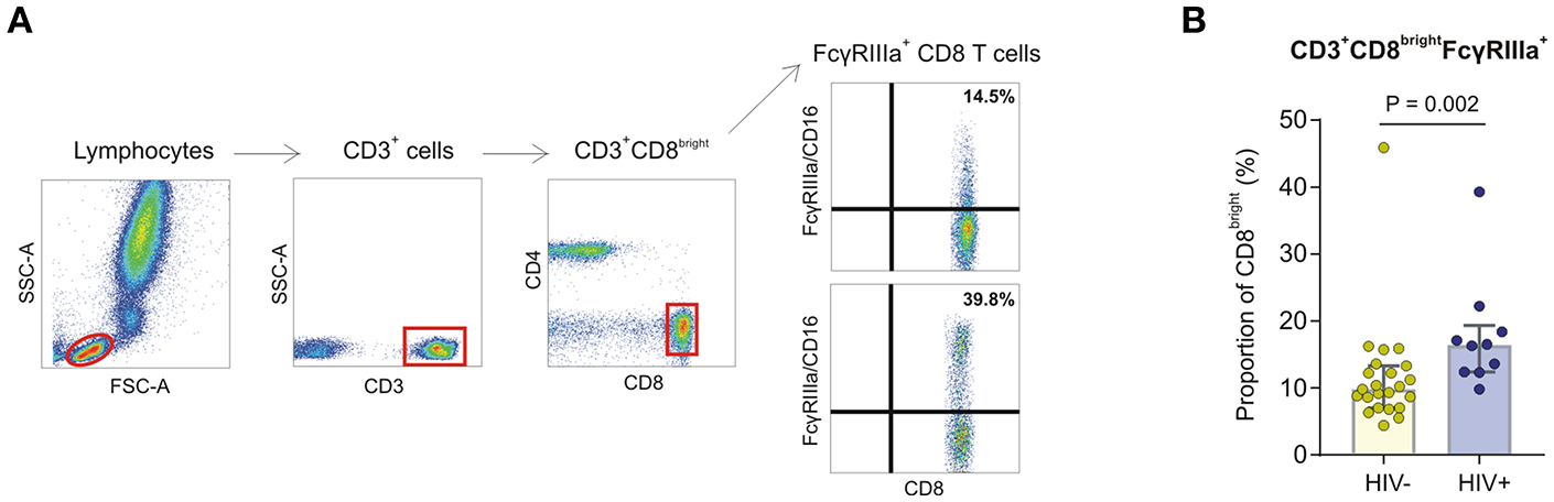 FcγRIIIa expression on CD8 T cells in whole blood obtained from HIV-1 negative and HIV-1 positive donors. (A) Gating strategy showing two representative individuals with low and high proportions of FcγRIIIa+CD8bright T cell subsets. (B) Frequencies of FcγRIIIa+CD8bright T cells in whole blood isolated from HIV-negative healthy controls (n = 23) and HIV-infected individuals (n = 10).