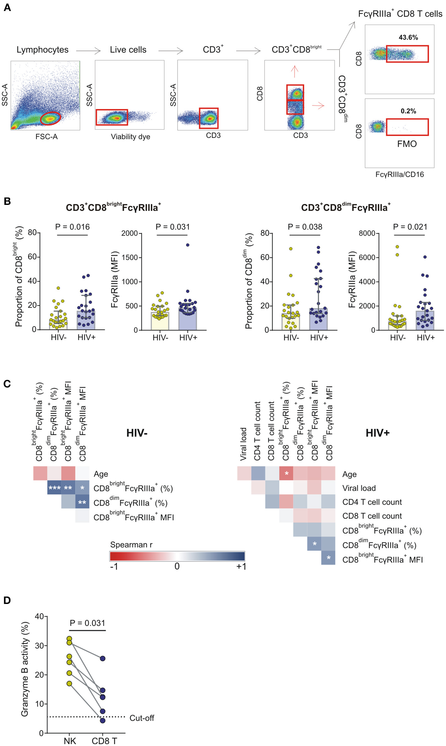 FcγRIIIa expression on CD8 T cells in HIV-1 uninfected and HIV-1 infected individuals matched for FCGR genetic variants. (A) Gating strategy; (B) The proportion of FcγRIIIa+CD8bright and FcγRIIIa+CD8dim T cells and corresponding median fluorescence intensity (MFI) of FcγRIIIa on these FcγRIIIa+CD8+ T cell subsets in a cohort of HIV-1 uninfected and infected individuals; (C) Correlation analysis between demographic, clinical, phenotypic, and functional variables in HIV-1 uninfected and HIV-1 infected individuals; (D) CD8+ T cell-mediated ADCC responses of HIV-1 positive donors relative to autologous NK cell-mediated ADCC responses at the same effector-to-target cell ratio (***P < 0.001; **P < 0.01; *P < 0.05).