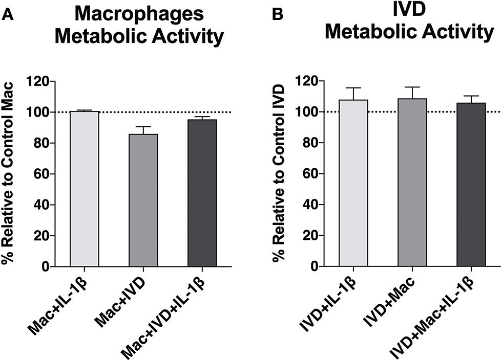 The IVD and macrophage metabolic activity was determined through resazurin reduction assay. Briefly, after macrophage-IVD co-culture, the transwells containing macrophages were transferred to another plate. Both, IVDs and macrophages were separately incubated with resazurin redox dye (0.01 mg/mL) (Sigma-Aldrich) for 4 h at reduced oxygen atmosphere (37°C, 6% O2 and 8.5% CO2) and saturated humidity. Fluorescence intensity was measured (530 nm Ex/590 nm Em) using the multi-mode microplate reader Synergy MX (BioTek). Data is presented in percentage relative to control macrophages or control IVD.