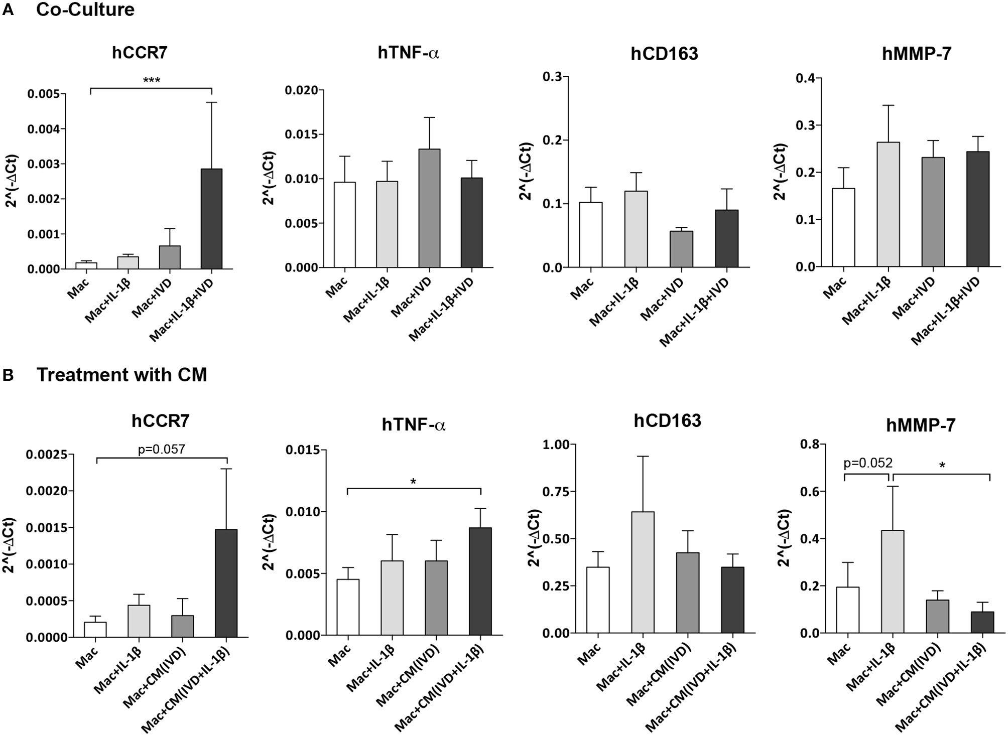 Macrophage gene expression profile alone or in the presence of IVD, in normal or proinflammatory/degenerative conditions. (A) Three days after co-culture, macrophage mRNA expression of human CCR7 (hCCR7), hTNF-α, hCD163 and hMMP-7 was evaluated. mRNA levels were normalized to hGAPDH control gene (n = 5 macrophage donors and n = 3 bovine IVD donors; ***p < 0.001) (B) Three days after treatment with IVD conditioned media (CM), macrophage mRNA expression of human CCR7 (hCCR7), hTNF-α, hCD163, and hMMP-7 was evaluated. mRNA levels were normalized to hGAPDH control gene (n = 6 macrophage donors and n = 3 bovine IVD donors; *p < 0.05).