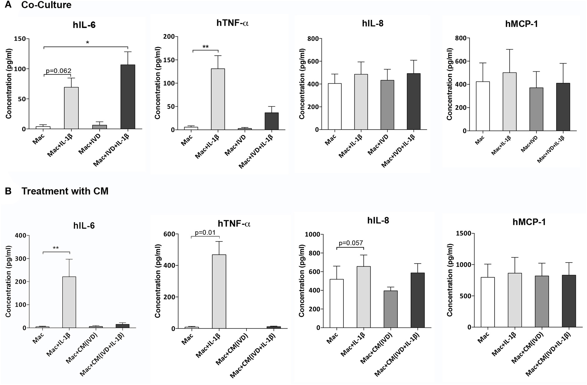Macrophage cytokine production alone or in the presence of IVD, in normal or proinflammatory/degenerative conditions. (A) Three days after co-culture, macrophage cytokine production of human IL-6 (hIL-6), hTNF-α, hIL-8, and hMCP-1 was evaluated by ELISA. Concentration in the culture media presented as pg/mL (n = 8 macrophage donors and n=5 bovine IVD donors; *p < 0.05, **p < 0.01) (B) Three days after treatment with IVD conditioned media (CM), macrophage cytokine production of human IL-6 (hIL-6), hTNF-α, hIL-8 and hMCP-1 was evaluated by ELISA. Concentration in the culture media presented as pg/mL (n = 5 macrophage donors and n=3 bovine IVD donors; **p < 0.01).