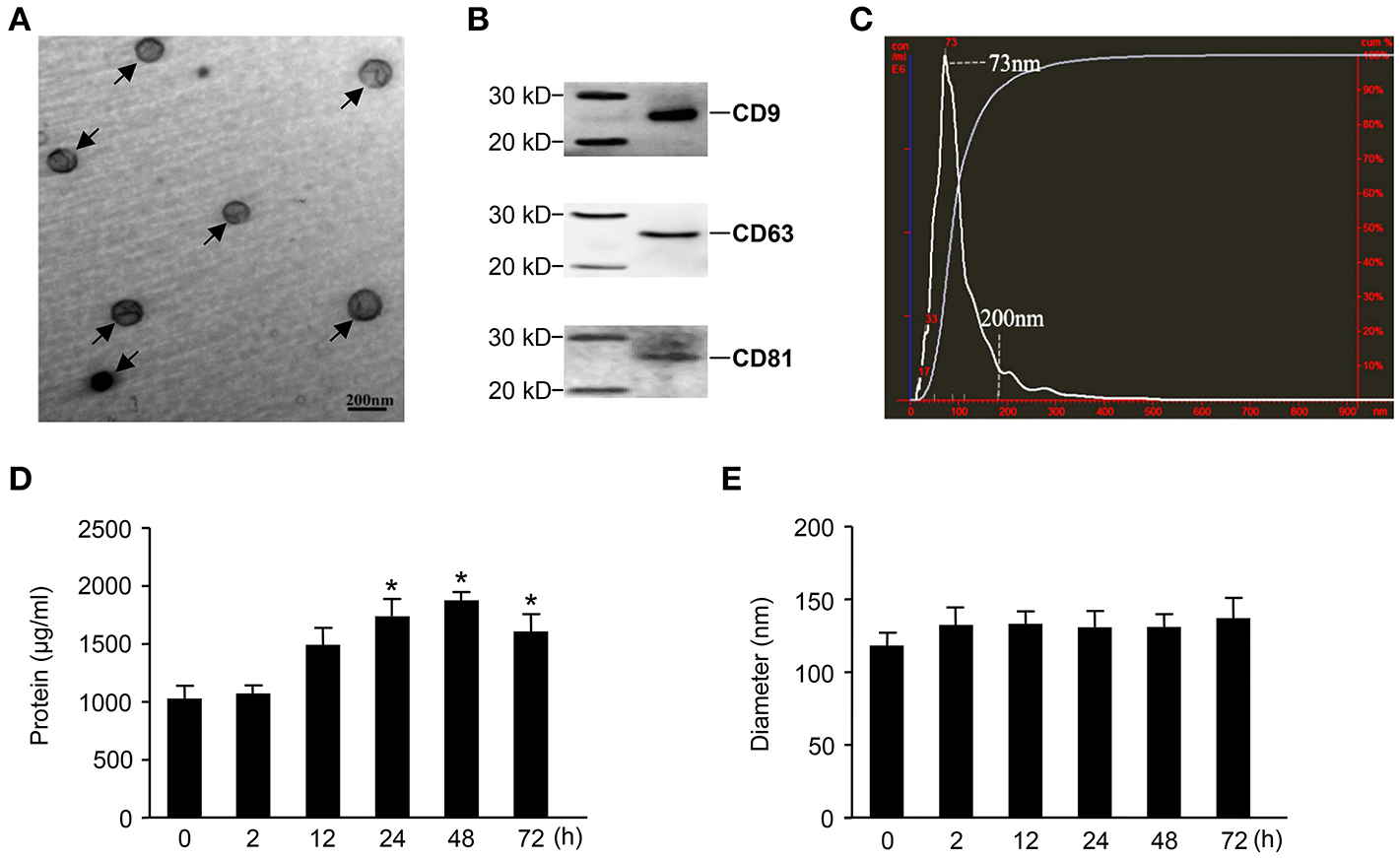 Characterization of exosomes derived from septic mouse serum. (A) Electron microscope (EM) analysis of exosomes. The circular particles representing exosomes are indicated by arrows. The scale bar represents a length of 200 nm. (B) Exosomes containing 20 μg of proteins were used to detect exosome-specific proteins (CD9, CD63, and CD81) by Western blot. (C) The size distribution of exosomes was determined by nanoparticle tracking analysis (NTA). (D) Dynamic change in exosome protein concentrations. The exosomes were separated from 200 μl of serum harvested from septic mice at different time points for protein quantitation. (E) The sequential detection of exosomes derived from septic mouse serum. The particle sizes of exosomes were analyzed by the NTA technique. Data are shown as the mean ± SD from three independent experiments (n = 3) and analyzed by one-way ANOVA. *P < 0.05, compared with the 0 h as the control.