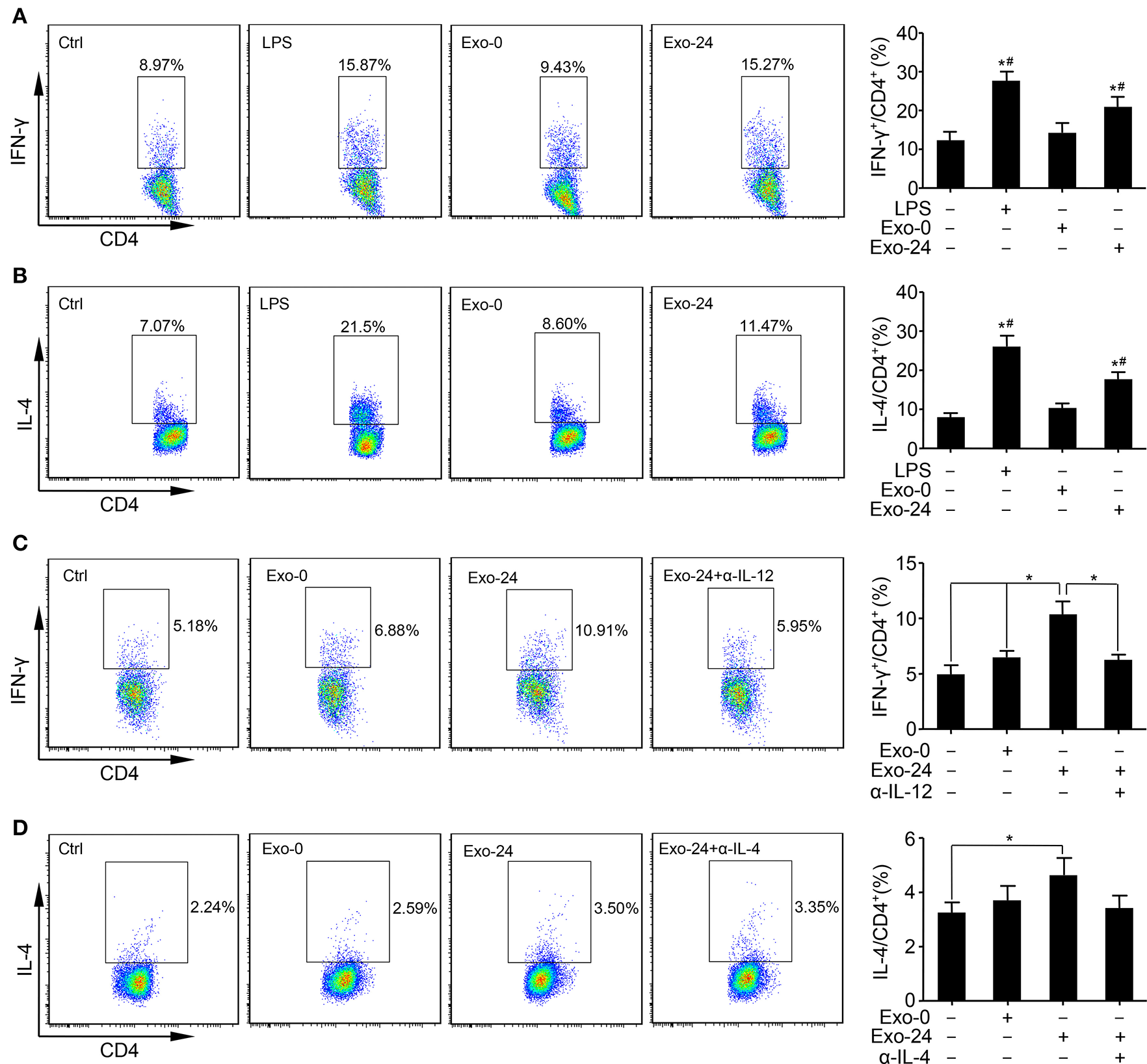 Figure 3. Exosomes from septic mice augmented Th1 and Th2 differentiation. (A) The Th1 response was augmented by exosomes harvested from septic mouse serum. Lymphocytes were purified from the spleens of C57BL/6 mice and incubated with LPS (1 μg/ml) or exosomes (Exo-0 or Exo-24, 10 μg/ml) for 72 h. Flow cytometry analysis was performed to determine the percentage of Th1 cells by quantitating the ratio of IFN-γ-expressing cells to CD4+ T cells. Lymphocytes stimulated with LPS for 72 h (LPS group) were used as a positive control. Data are presented as the mean ± SD (n = 4), *P < 0.05 vs. the control group; #P < 0.05 vs. the Exo-0 group. (B) The Th2 response was augmented by exosomes harvested from septic mouse serum. Splenic lymphocytes were acquired as described above. After incubation with LPS, Exo-0 or Exo-24 for 72 h, the percentage of Th2 cells was quantitated by the ratio of IL-4-expressing cells to CD4+ T cells by flow cytometry. Lymphocytes stimulated with LPS for 72 h (LPS group) were used as a positive control. Data are presented as the mean ± SD (n = 4), *P < 0.05 vs. the control group; #P < 0.05 vs. the Exo-0 group. (C) The blocking effect of a neutralizing antibody against IL-12 on the Th1 response augmented by exosomes harvested from septic mice. Purified T cells from splenic lymphocytes of C57BL/6 mice were incubated with exosomes (Exo-0 or Exo-24, 10 μg/ml) for 72 h. For the blocking assay, exosomes from the sera of septic mice (Exo-24) were preincubated with an IL-12 neutralizing antibody (1 μg/ml) at 37°C for 1 h (Exo-24+α-IL-12 group) to test its inhibitory effect on the Th1 response. The percentage of Th1 cells was determined by the method described above. Data are presented as the mean ± SD (n = 4), *P < 0.05, the Exo-24 group vs. the control, Exo-0 and Exo-24+α-IL-12 groups. (D) The blocking effect of a neutralizing antibody against IL-4 on the Th2 response augmented by exosomes harvested from septic mice. T cells were purified and incubated as described above. For the blocking assay, exosomes from the sera of septic mice (Exo-24) were preincubated with an IL-4 neutralizing antibody (1 μg/ml) at 37°C for 1 h (Exo-24+α-IL-4 group) to test its inhibitory effect on the Th2 response. The percentage of Th2 cells was quantitated as described above. Data are presented as the mean ± SD (n = 4), *P < 0.05 vs. the control group.