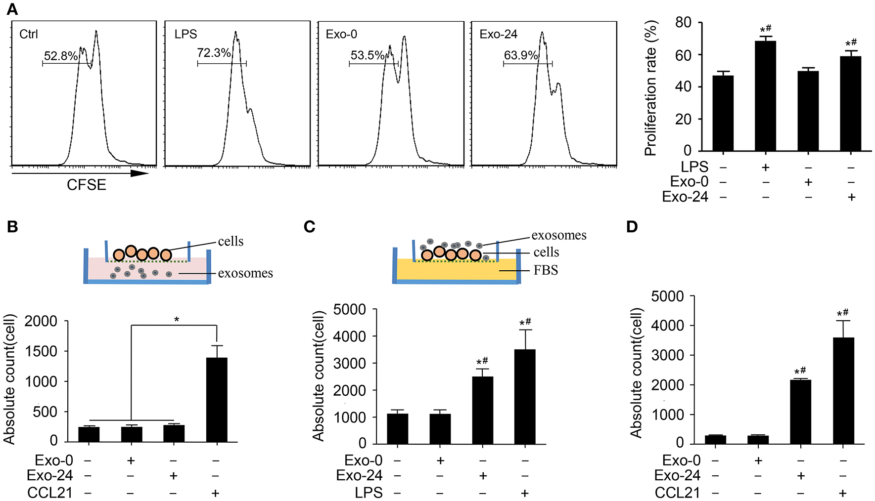 Exosomes from septic mice augmented the proliferation and migration of lymphocytes. (A) Lymphocyte proliferation was enhanced by exosomes harvested from septic mice. Splenic lymphocytes were stained with CFSE and incubated with Exo-0 or Exo-24 for 72 h. Proliferation was quantitated as the percentage of CFSElow cells by FACS. Lymphocytes challenged with LPS for 72 h (LPS group) were used as the positive control. Data are presented as the mean ± SD (n = 4). *P < 0.05, vs. the control group; #P < 0.05, vs. the Exo-0 group. (B) Exosomes from septic mice failed to directly induce lymphocyte migration. Splenic lymphocytes were seeded on the bottom of the upper transwell unit, and exosomes (Exo-0 or Exo-24, 10 μg/ml) or CCL21 (1 μg/ml) was then added to the lower chamber to perform the transwell migration assay. The migration lymphocytes were counted after 8 h. Data are presented as the mean ± SD (n = 3). *P < 0.05, CCL21 group vs. the control, Exo-0 and Exo-24 groups. (C) Preincubation with exosomes harvested from septic mice enhanced lymphocyte migration. After preincubation with exosomes (Exo-0 or Exo-24, 10 μg/ml) or LPS (1 μg/ml) for 24 h, lymphocytes were seeded in the upper unit, and 10% FBS was added to the bottom unit as the chemoattractant. The lymphocytes chemoattracted to the lower unit were counted after 8 h. Data are presented as the mean ± SD (n = 3). *P < 0.05, vs. the control group; #P < 0.05, vs. the Exo-0 group. (D) Exosomes from septic mice augmented the chemotaxis of lymphocytes in vivo. An air pouch mouse model was reproduced, and exosomes (Exo-0 or Exo-24, 10 μg/ml) or CCL21 (1 μg/ml) were injected into the dorsal air pouches of the mice. The chemoattracted lymphocytes were counted after 12 h. Data are presented as the mean ± SD (n = 3). *P < 0.05, vs. the control group; #P < 0.05, vs. the Exo-0 group.