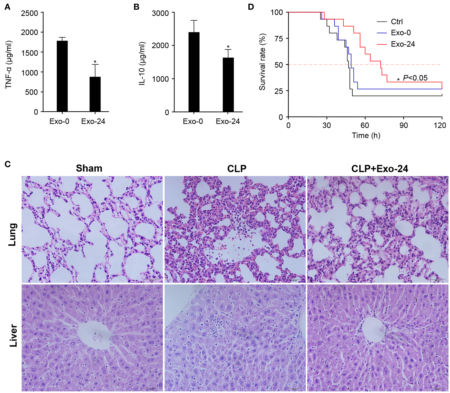 Pretreatment with exosomes from septic mice reduced the inflammatory response and tissue injury in CLP model mice. (A) Inhibitory effect of exosomes from septic mice on TNF-α production. Exosomes (Exo-0 or Exo-24, 100 μg/mouse) were administered to recipient mice on days 1/3/5 via tail vein injection (TVI). The CLP model was established on day 7, and sera from the mice were collected at 8 h after CLP modeling for the quantitation of TNF-α by xMAP technology. Data are shown as the mean ± SD. *P < 0.05 vs. the Exo-0 group. (B) Exosomes from septic mice reduced the level of IL-10. After CLP treatment for 8 h, IL-10 in the serum was quantitated by xMAP technology. Data are shown as the mean ± SD. *P < 0.05 vs. the Exo-0 group. (C) Exosomes from septic mice restrained lung and liver tissue injury in septic mice. HE staining was performed to detect the morphological changes in lung and liver tissues harvested from CLP mice either preinjected with exosomes from septic mice 3 times as described above or not. (D) Exosomes from septic mice significantly prolonged the survival times of CLP mice. Exosomes (Exo-0 or Exo-24, 100 μg/mouse) were intravenously injected into mice, and the CLP model was established as described above. Then, their survival times were observed, and the Kaplan-Meier method was used to evaluate survival curves. P < 0.05 was considered statistically significant.