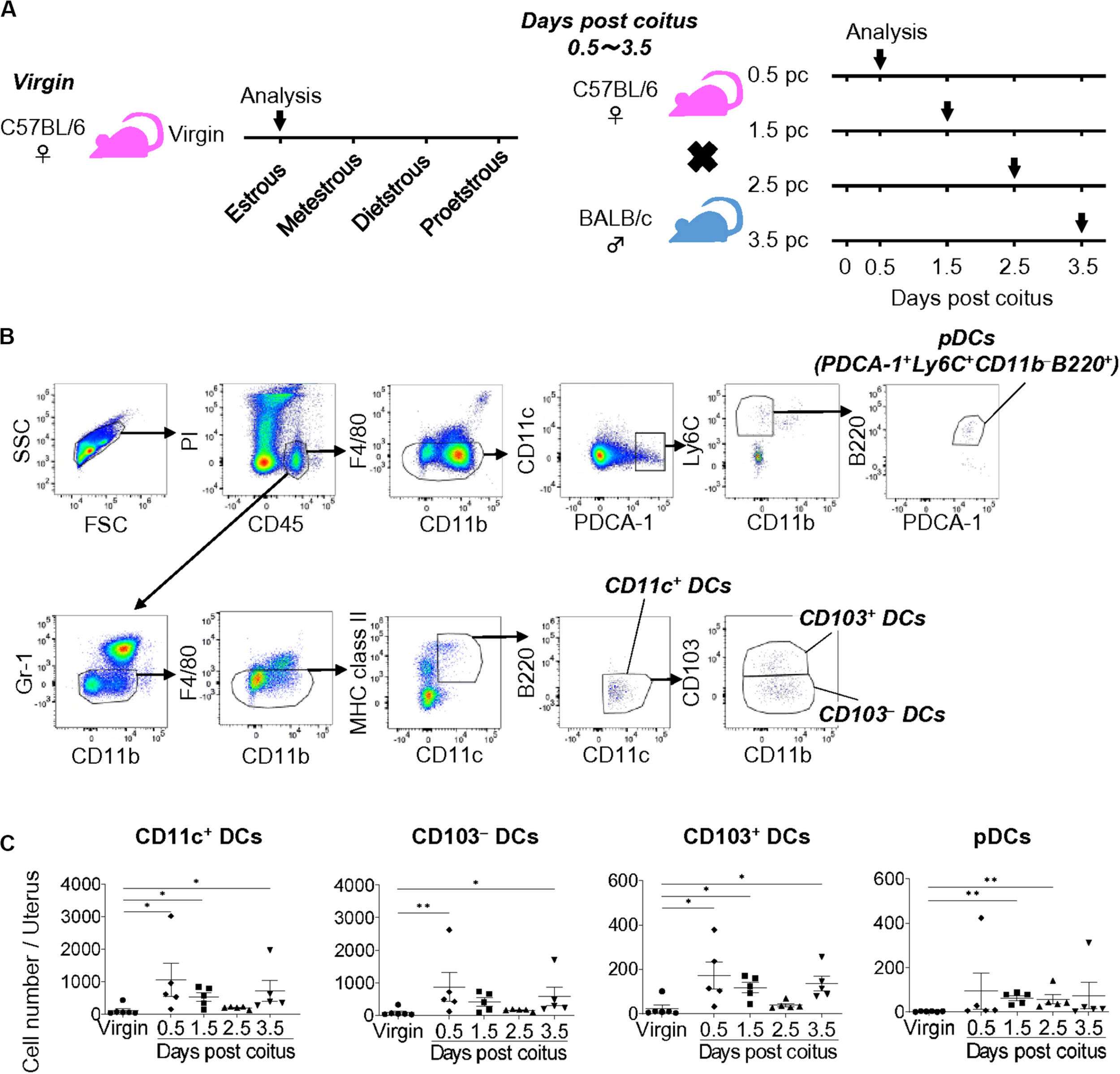 Cell numbers of uDCs after coitus in allogeneic mating. (A) Experimental time course. The DCs in the uterus in non-mated control virgin mice and mice on days 0.5, 1.5, 2.5, and 3.5 pc were analyzed by flow cytometry. (B) Gating strategy was used to identify CD103– DCs, CD103+ DCs, and pDCs in the uterus. (C) Graphs show number of CD11c+ DCs and each DC subset in the uterus at each time point. A minimum of five samples from each time point were analyzed. Data represent mean ± SEM and are representative of three independent experiments. Statistical comparisons were performed using Kruskal-Wallis test with Dunn’s multiple comparisons test (∗∗P < 0.01, ∗P < 0.05).