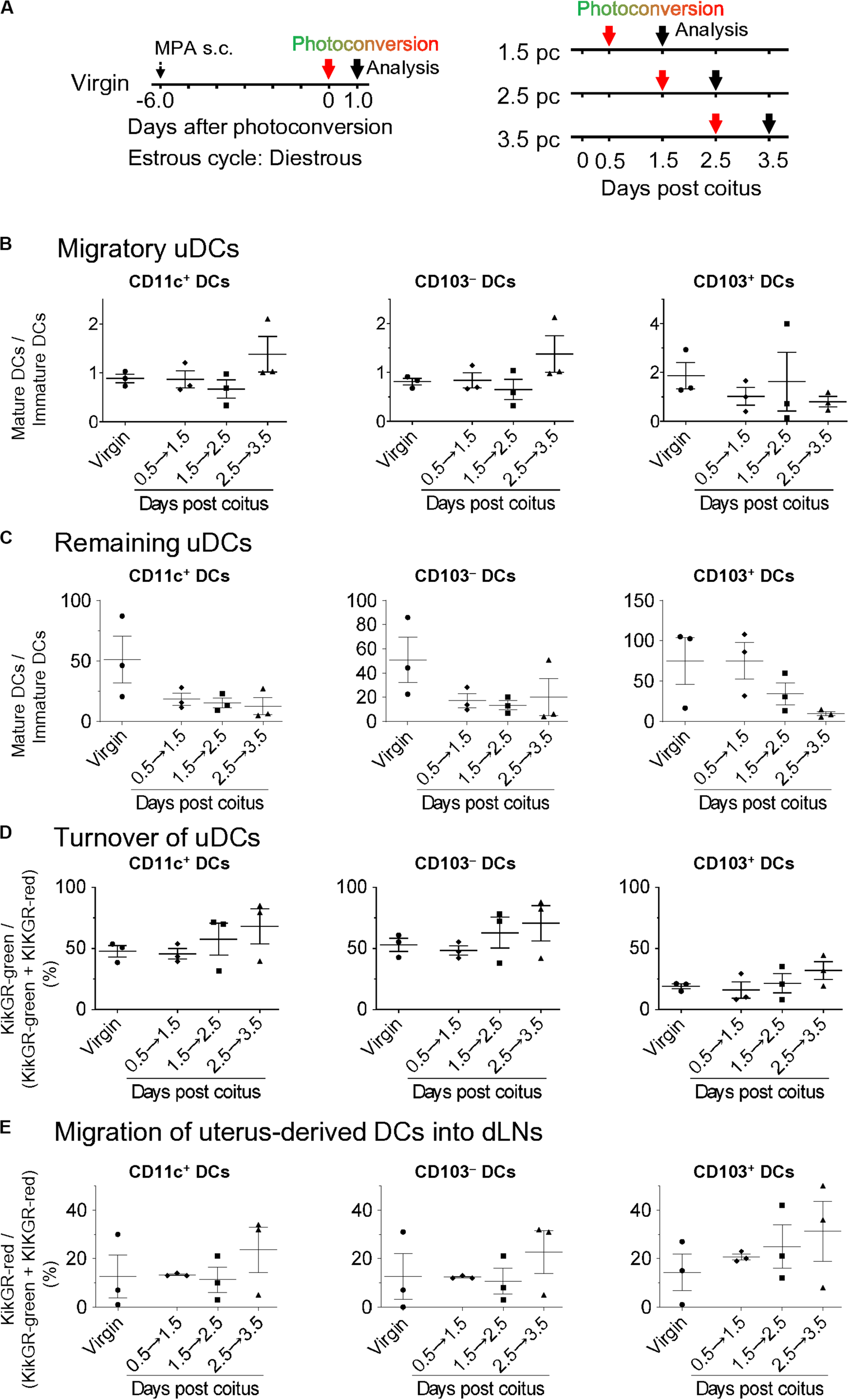 Time course for migratory DCs and remaining DCs in the uterus and dLNs after coitus in allogeneic mating. (A) Experimental time course. Virgin mice were synchronized at the diestrous stage, and the uteri of mice after coitus in allogeneic mating were photoconverted on days 0.5, 1.5, and 2.5 pc. The DCs in the uteri and dLNs were analyzed 24 h after photoconversion. (B–E) Graphs show the ratio of mature DCs/immature DCs (B,C) in each DC subset labeled with KikGR-green (B) and KikGR-red (C), and proportion of each DC subset labeled with KikGR-green in the uterus, (D) and KikGR-red within MHC class II high DC subset in the dLNs (E) out of the total DCs 24 h after photoconversion. Three samples from each time point were analyzed. Data represent mean ± SEM (B–E) and are representative of three independent experiments. Statistical comparisons were performed using the Kruskal-Wallis test with Dunn’s multiple comparisons test.