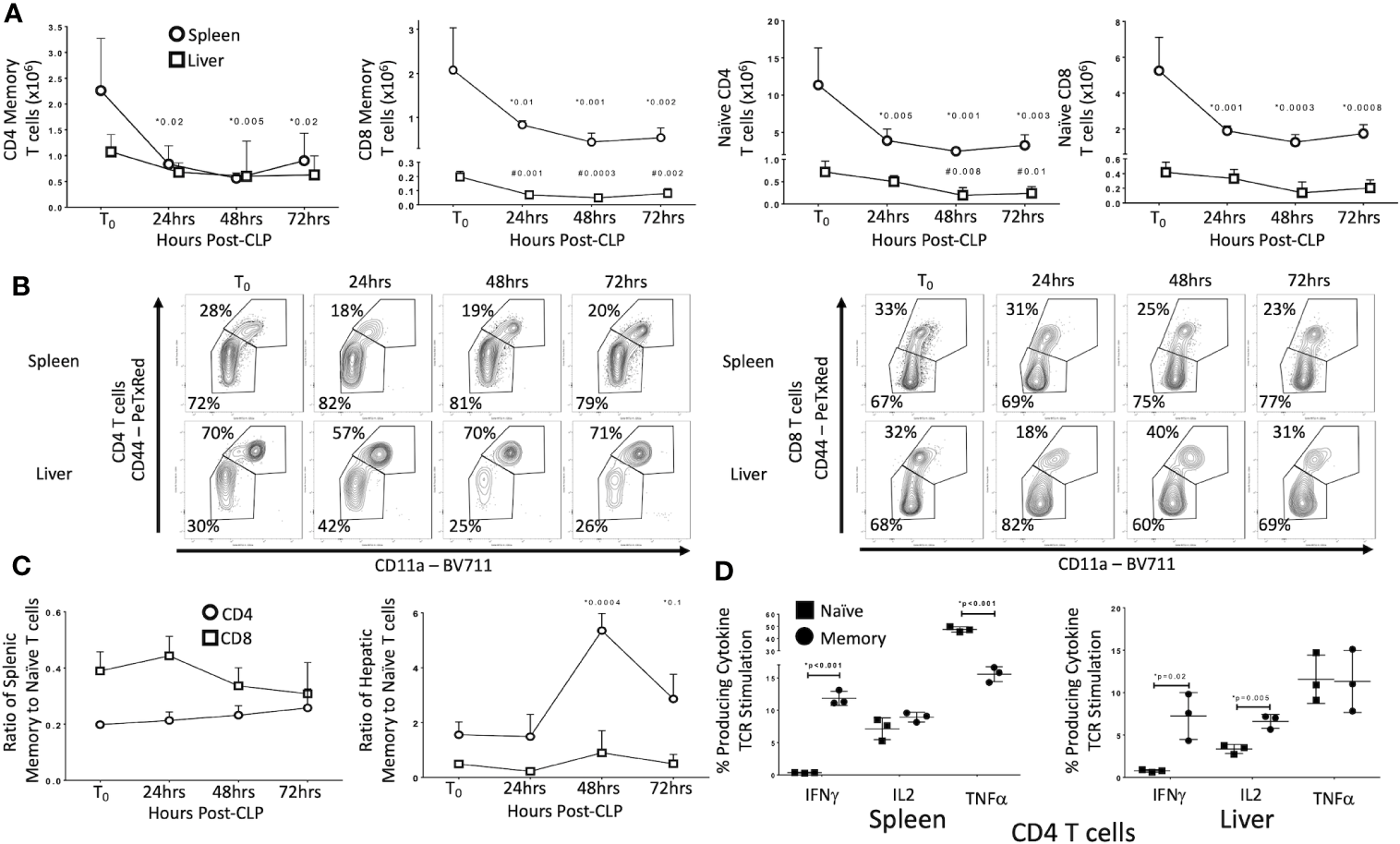 Figure 1 Effects of CLP on memory and naïve T cell subtypes in the spleen and liver. C57Bl/6 laboratory mice underwent CLP and were sacrificed at given timepoints. Data obtained using flow cytometry. Unoperated mice were used as T0 controls. Data as mean ± SEM, p<0.05 for spleen (*) or liver (#) compared to T0 by one-way ANOVA with Dunnett correction for multiple comparisons. Figures representative of at least two independent experiments. (A) Total CD4 and CD8 Memory and Naïve T cells as a function of time post-CLP. Spleen – circles, Liver – squares. Gating: FSC/SSC, singlets, Live, CD90/CD4, CD90/CD8, CD44/CD11a; N = 3–4/group. (B) Flow cytometric plots of CD4 (left) and CD8 T cells (right) by CD44/CD11a from the spleen (top) and liver (bottom) at T0, 24, 48, and 72 h with percentage of parent in gate. Gating: FSC/SSC, singlets, Live, CD90/CD4, CD90/CD8, CD44/CD11a; N = 3–4/group. (C) Ratio of splenic and hepatic memory to naïve T cells over time. Gating: FSC/SSC, singlets, Live, CD90/CD4, CD90/CD8, CD44/CD11a; N = 3–4/group. (D) Percentage of memory and naïve CD4 T cells producing cytokine after 5 h ex vivo stimulation with CD3/CD28. Gating: FSC/SSC, singlets, Live, CD90/CD4, CD90/CD8, CD44/CD11a, IFNγ, IL2, TNFα. N= 3/group. *p<0.05 for all studies by two-way Student’s T-test.