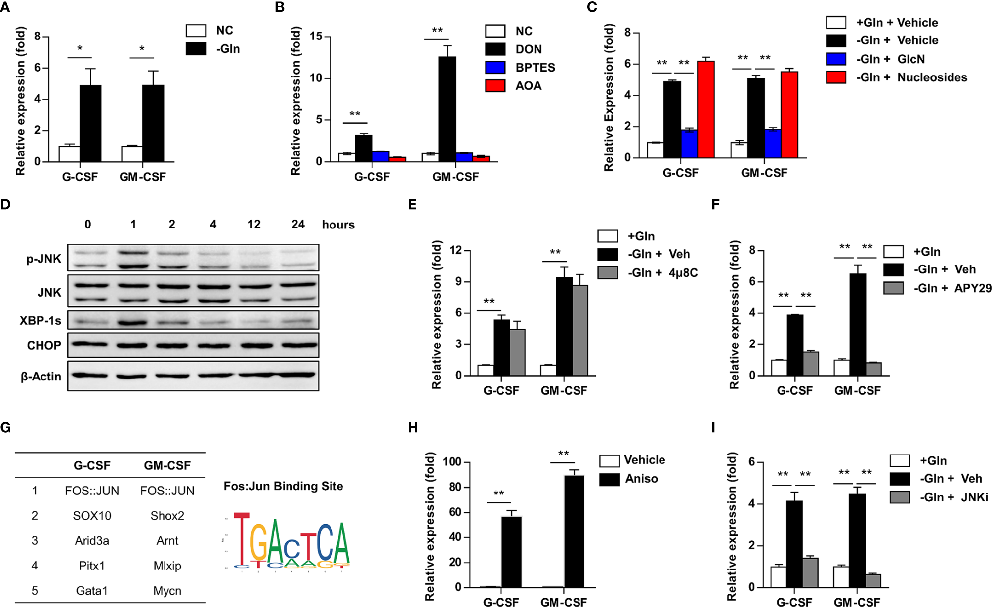 Glutamine deprivation enhances the expression of G-CSF and GM-CSF by activating IRE1α-JNK pathway. (A) 4T1 cells was cultured with (NC) or without (-Gln) glutamine for 24h. The expression of G-CSF and GM-CSF were determined by qRT-PCR and summarized as means ± SEM. n = 3; *P < 0.05. (B) The expression of G-CSF and GM-CSF were quantified in 4T1 cells treated with or without glutamine metabolism inhibitors for 24h. DON, pan inhibitor of glutamine utilization; BPTES, inhibitor of the glutaminase GLS1; AOA, inhibitor of aminotransferase. n = 5; **P < 0.01. (C) 4T1 cells were cultured in complete medium (+Gln +Veh) or glutamine deprived medium (-Gln) supplemented with vehicle(+Veh), glucosamine(+GlcN) or nucleosides. The expression of G-CSF and GM-CSF were shown as means ± SEM. n = 4; **P < 0.01. (D) Western blot showed the level of p-JNK, JNK, XBP-1s, and CHOP in 4T1 cells after glutamine starvation. (E, F) The expression of G-CSF and GM-CSF were quantified in glutamine deprived 4T1 cells supplemented with glutamine, or treated with vehicle, 4μ8C (inhibitor of IRE1α endoribonuclease activity) (E) or APY29 (inhibitor of IRE1α kinase activity) (F) for 24 h. n = 3 in (E), n=4 in (F); **P < 0.01. (G) Transcript factors that could bind to the promoter of G-CSF and GM-CSF were predicted by JASPAR database. (H) 4T1 cells were cultured in complete medium treated with vehicle or anisomysin (JNK agonist) for 24 h. The expression of G-CSF and GM-CSF were summarized as means ± SEM. n = 3; **P < 0.01. (I) 4T1 cells were cultured in complete medium or glutamine-deprived medium treated with vehicle or SP600125 (JNK antagonist) for 24 h. The expression of G-CSF and GM-CSF were shown as means ± SEM. n = 3; **P < 0.01.