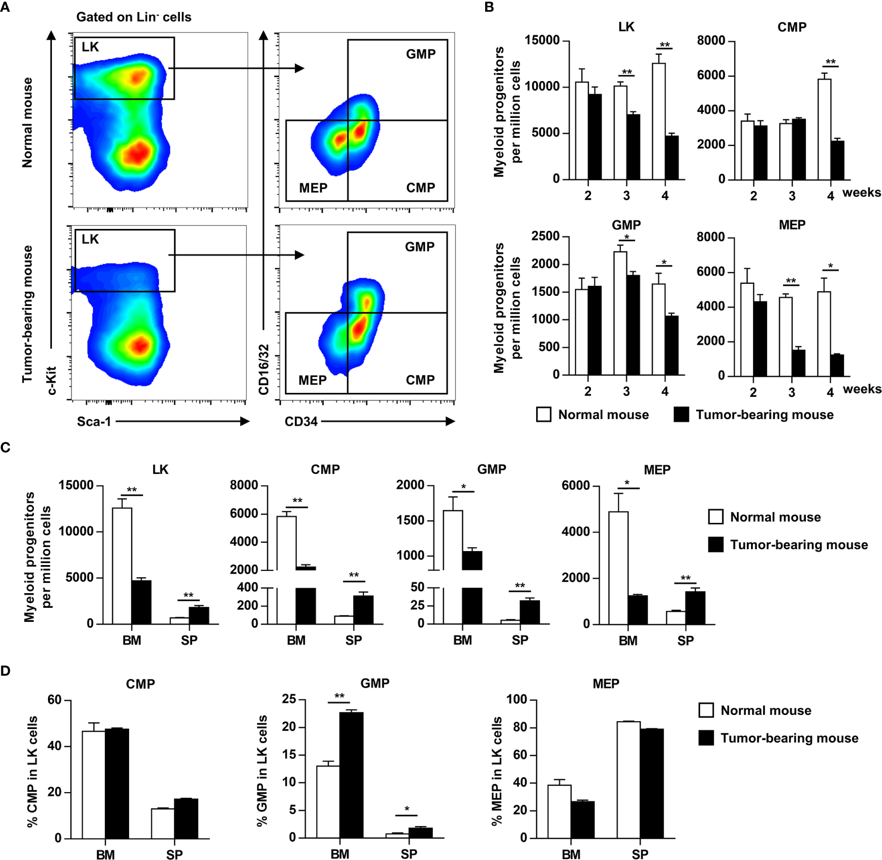 Myeloid progenitors are mobilized from bone marrow to the periphery as tumor progresses. (A) Myeloid progenitor subsets in the bone marrow (BM) of normal or tumor-bearing mice were analyzed by flow cytometry 4 weeks after tumor inoculation. LK, Lineage-c-Kit+ cells; CMP, common myeloid progenitors; GMP, granulocyte–macrophage progenitors; MEP, megakaryocyte–erythroid progenitors. (B) The number of myeloid progenitor subsets in the bone marrow of normal or tumor-bearing mouse at indicated time after tumor inoculation were shown as means ± SEM. n = 3~5/group; *P < 0.05; **P < 0.01. (C) The number of myeloid progenitors in bone marrow and spleen of normal or tumor-bearing mouse 4 weeks after tumor implantation were summarized as means ± SEM. n = 3; *P < 0.05; **P < 0.01. (D) The proportion of CMP, GMP, and MEP in LK cells of bone marrow and spleen from normal or tumor-bearing mouse were summarized as means ± SEM. n = 3; *P < 0.05; **P < 0.01.
