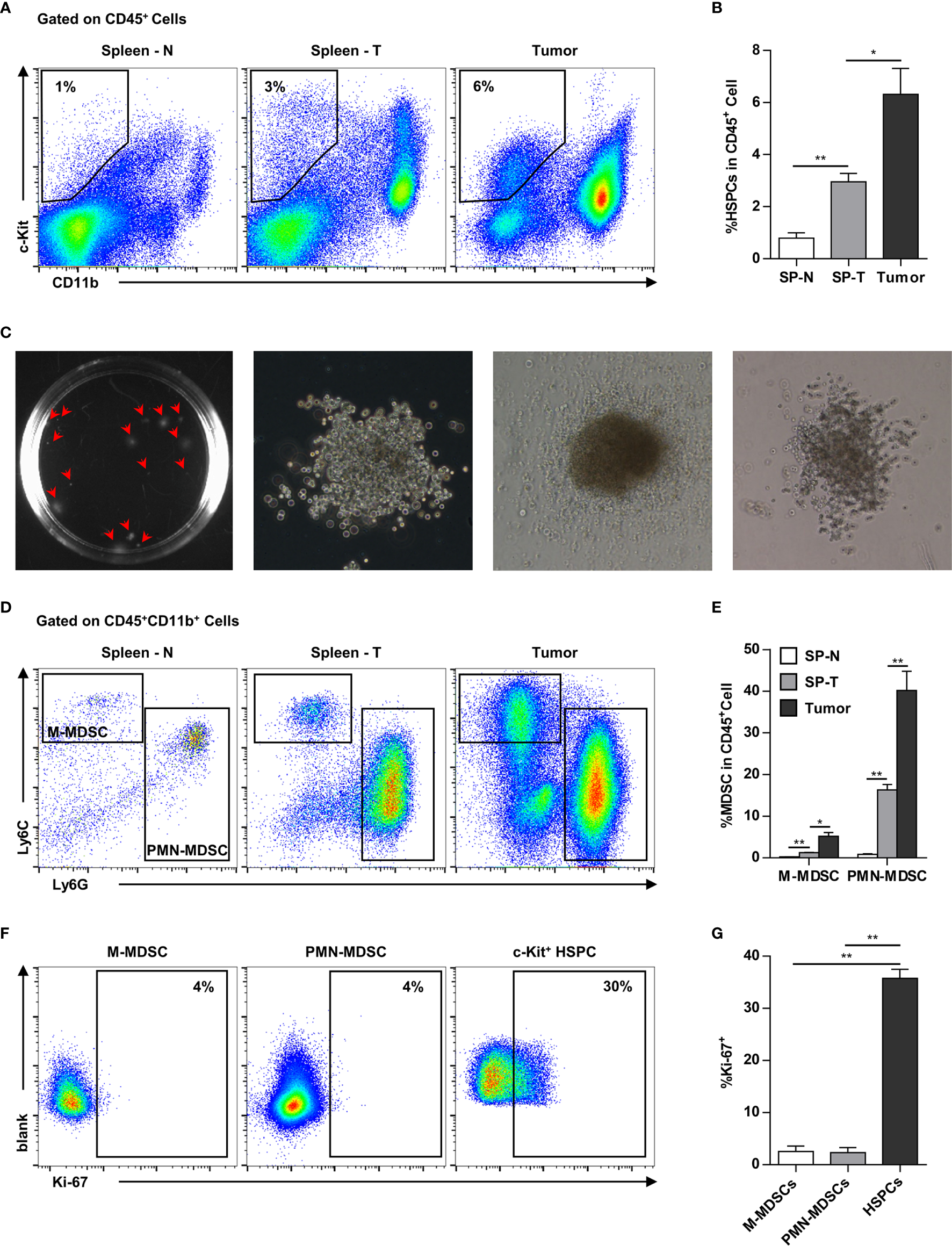 Myeloid progenitor cells are further enriched in the tumor tissues. (A, B) Representative flow cytometry showed the proportion of CD11b-c-Kit+ hematopoietic precursors in the spleen of normal mice (Spleen - N; SP-N), the spleen (Spleen - T; SP-T) and tumor tissue of tumor-bearing mice (A). The percentage of hematopoietic precursor cells was summarized as means ± SEM in (B). n = 3; *P < 0.05; **P < 0.01. (C) Colony forming assay showed the myelopoiesis capacity of tumor-infiltrating precursors. (D, E) The proportion of M-MDSC and PMN-MDSC in the spleen of normal mice (Spleen - N; SP-N), the spleen (Spleen - T; SP-T) and tumor tissue of tumor-bearing mice were analyzed by flow cytometry (D) and summarized as means ± SEM in (E). n = 3; *P < 0.05; **P < 0.01. (F, G) The proliferation of M-MDSC, PMN-MDSC, and HPC in the tumor tissues were analyzed by flow cytometry (F) and summarized as means ± SEM in (G). n = 4; **P < 0.01.
