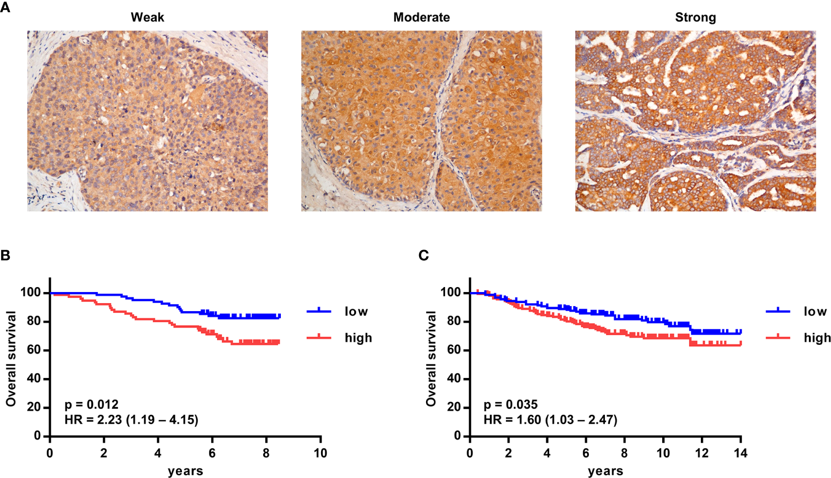 High G-CSF expression was significantly associated with decreased overall survival in human breast cancer patients. (A) Immunohistochemistry showed different expression levels of G-CSF in human breast cancer patients. (B, C) Kaplan–Meier plots of overall survival (OS) rates of breast cancer patients from two GEO data set (GSE1456 [B] and GSE20685 [C]) stratified by G-CSF expression. P value and hazard ratio (HR) was calculated by the log-rank test.