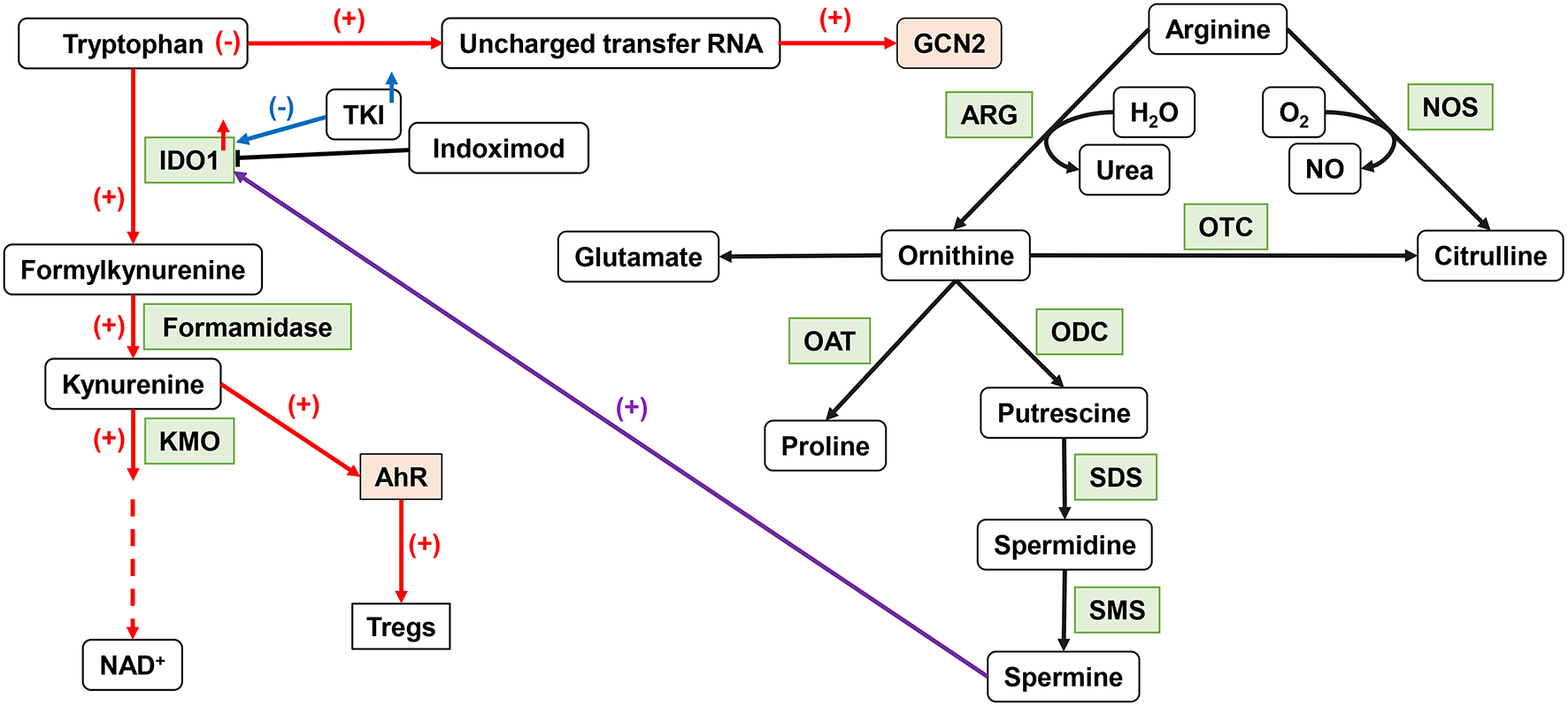 As a semi-essential amino acid, Arg is a major precursor for the synthesis of cancer-related compounds, such as NOS, NO, and polyamines (96). Both NOS and ARG1 catalyzed Arg decomposition. ARG1 breaks down Arg to produce urea and L-ornithine (Orn) for further protein synthesis. NOS can use Arg to produce NO and L-citrulline. TGF-β can induce the co-expression of IDO1 and ARG1 in DCs. There is also an intermediary pathway between IDO1 and ARG1: spermine, the downstream product of ARG1, can induce IDO1 in DC. Phosphorylation of IDO1 in DCs and the subsequent activation of IDO1 signals strictly depend on the prior expression of ARG1 and the production of ARG1-dependent polyamines. Polyamines can regulate DC differentiation to IDO1-dependent immunosuppressive phenotypes by activating steroid receptor coactivator (SRC) 1 kinase, which includes IDO1 phosphorylation activity (97). The expression of IDO, ARG1, or NOS2 will lead to a decrease of Trp and Arg levels and affect the nutrition-related signaling pathway. Decreased amino acid levels also affect the functional status of immune cells.