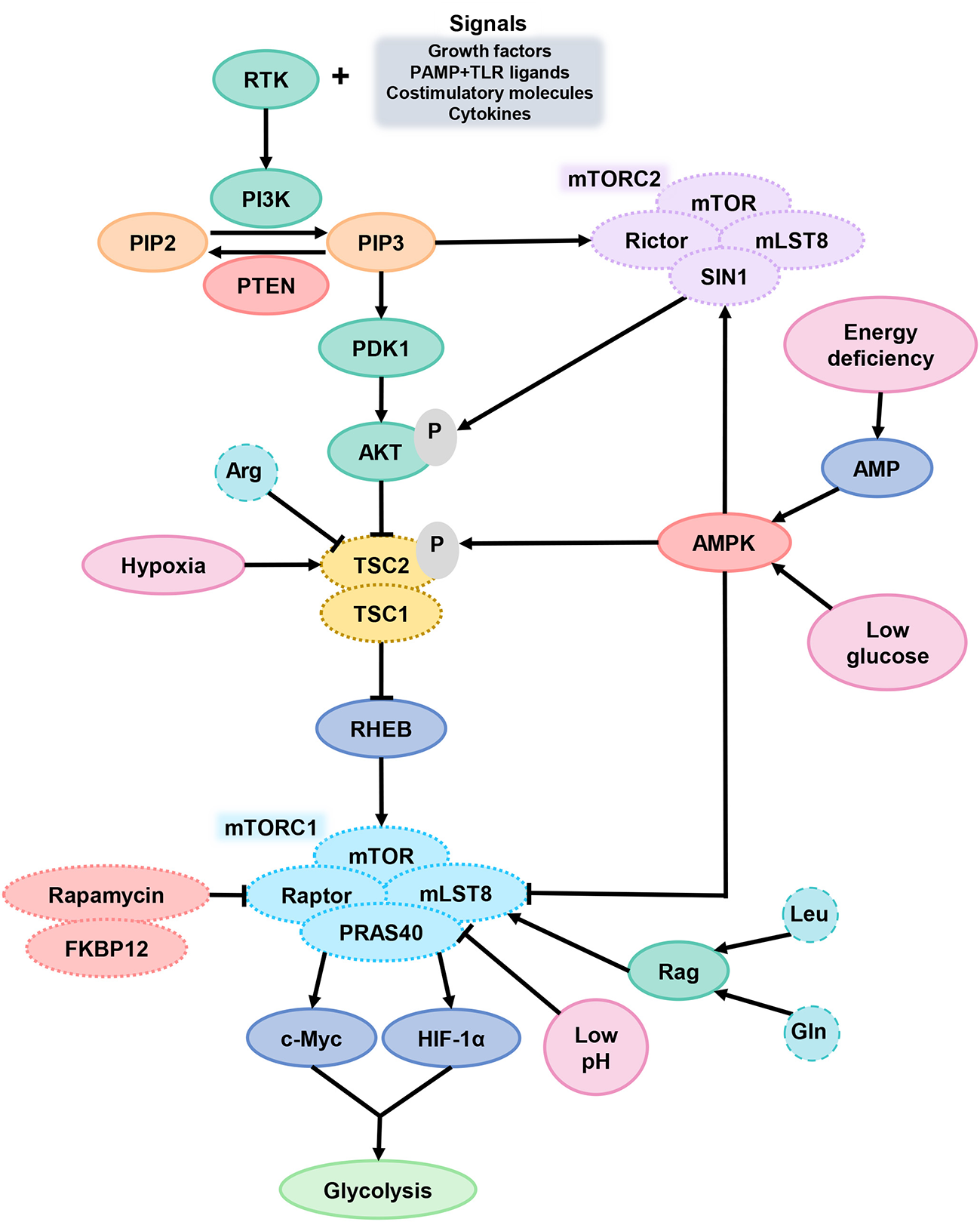 mTORC1 can promote glycolysis by improving the activity of transcription factors c-Myc and HIF-1α and is a central factor in coordinating the metabolic changes and immune response of DCs (103). The mTORC1 signaling pathway is sensitive to amino acid sufficiency through Ras-related GTPases (Rag), especially Arg, Gln, and leucine (Leu). Arg can inhibit TSC2 function for mTORC1 excitation. In a physiological situation, the decrease of glucose-6-phosphate level in extracellular fluid will facilitate the combination of mTORC1 and HK2, which caused the mTORC1 inhibition. DC hypoxia provokes DNA damage-induced transcript 4 (DDIT4) expression, which also suppress mTOR function via TSC2 (104).