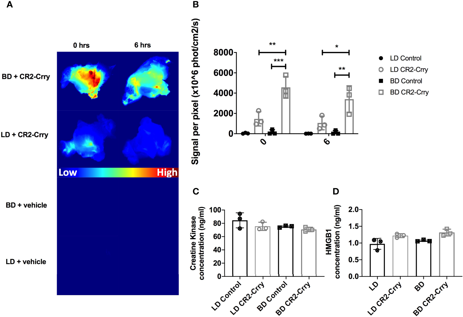 CR2-Crry binds at a higher level in BD donor grafts compared to LD grafts and is not associated with toxicity during cold storage. LD and BD VCAs were perfused with UW or UW augmented with fluorescently labeled CR2-Crry prior to graft harvest and grafts were imaged ex vivo. (A) Heatmaps showing fluorescence signal intensity of images of grafts at the beginning (t = 0) and end (t = 6hrs) of cold static storage and, (B) Their respective signal intensity quantification. Pairwise comparison at t=0 between BD vs BD+CR2-Crry (***p < 0.001), LD+CR2-Crry vs BD+CR2-Crry (**p < 0.01); difference between LD vs LD+CR2-Crry was not significant. Similarly, pairwise comparison at t=6hrs between BD vs BD+CR2-Crry (**p < 0.01), LD+CR2-Crry vs BD+CR2-Crry (*p < 0.05); difference between LD vs LD+CR2-Crry was not significant. Perfusates were collected from VCAs at the end of cold storage were assayed for the concentration of tissue injury markers creatine kinase (C) and HMGB1 (D) using ELISA. For CK, Pairwise comparisons between LD vs BD, LD vs LD+CR2-Crry, and BD vs BD+CR2-Crry, and LD vs BD+CR2-Crry were not significant. The same applies for HMGB1 except for LD vs BD+CR2-Crry (*p < 0.05). (n = 3, *p < 0.05, **p < 0.01, ***p < 0.001).