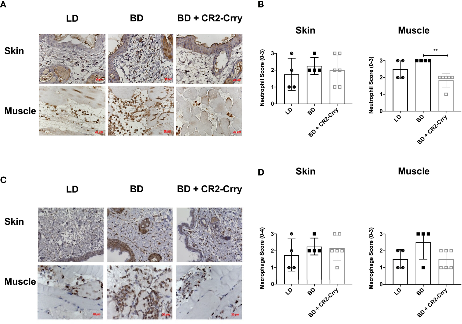 Pretransplant perfusion of BD donor grafts with CR2-Crry reduces immune cell infiltration at 48 hours post-transplantation. (A) Representative images of muscle and skin sections stained by IHC for neutrophils (Nimp). (B) Quantification of neutrophil infiltration in skin and muscle, showing a reduction in neutrophils in muscle of BD CR2-Crry treated donors as compared to BD control group (**p = 0.008). (C) Representative images of muscle and skin sections stained by IHC for macrophages (Mac-3). (D) Quantification of macrophage infiltration in skin and muscle, showing no significant reduction in macrophages in both skin and muscle of BD CR2-Crry treated donors as compared to BD or LD control groups.