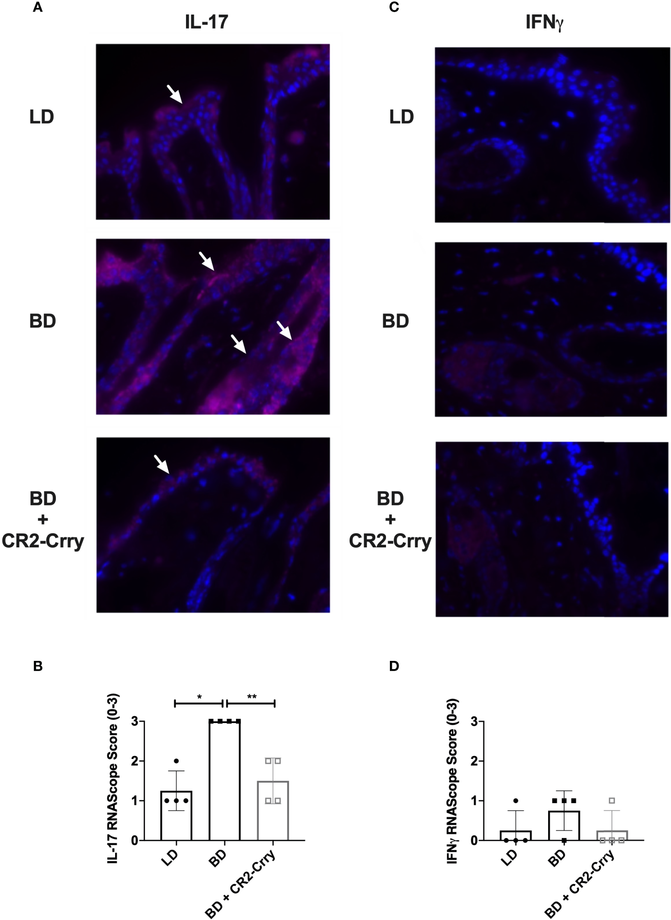 CR2-Crry donor therapy reduces intragraft IL-17 mRNA expression. Representative images from n = 4/group of IL-17 and IFNγ RNAScope in-situ hybridization (A, C). Positive mRNA signal (red) for IL-17 was seen in the squamous epithelim of all groups (A), but was quantitatively increased in recipients of brain dead donor grafts (B). No significant mRNA for IFNγ was noted in the epithelium or immune cells in any group (C, D). Images x60 magnification, n = 4 all groups. Pairwise comparison for IL-17 between LD vs BD (*p < 0.03), and BD vs BD+CR2-Crry (**p < 0.04); differences between LD vs BD+CR2-Crry were not significantly different.