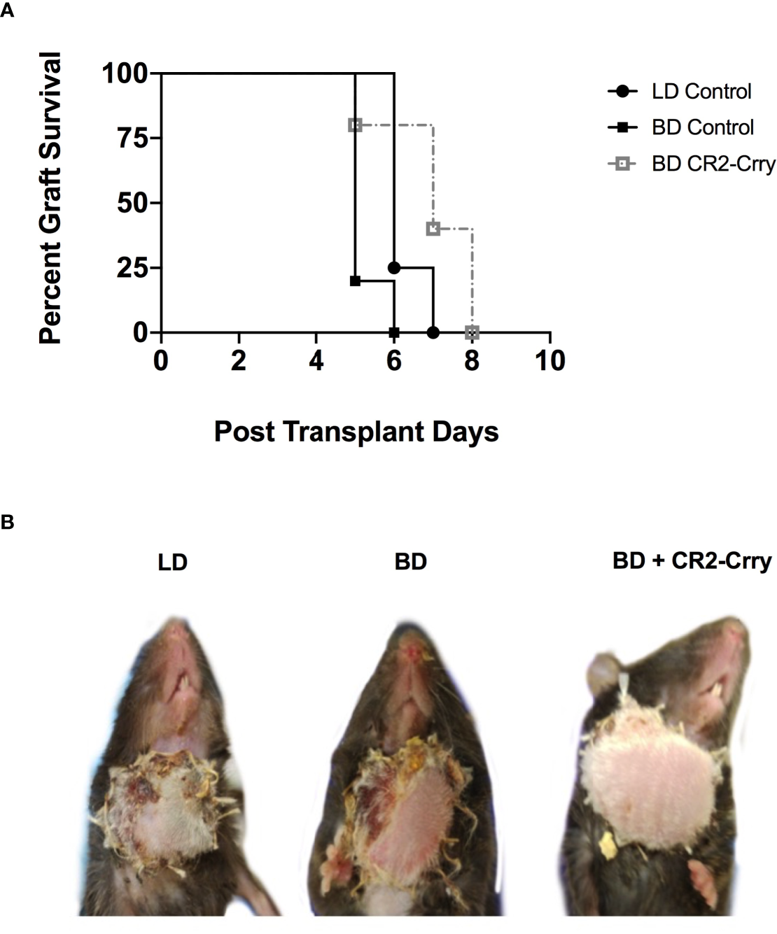 Impact of BD and CR2-Crry BD donor pre-treatment on VCA survival. (A) VCA graft survival curve. (B) Representative images of recipient mice at day 5 post-Tx. Logrank tests comparing survival across the 4 groups demonstrated survival times were significantly different between groups (p < 0.0001). All pairwise comparisons demonstrated that survival was significantly greater among each group when compared to the BD group (for LD vs BD, and for BD vs BD+CR2-Crry), even after a Holm-Sidak adjustment for multiple comparisons. No significant difference was seen between living BD or BD+CR2-Crry. (n = 4-6).