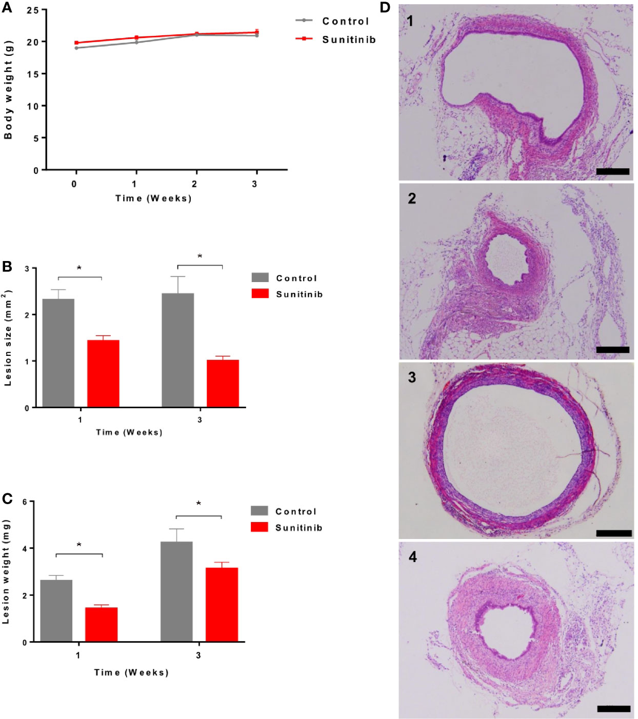 Figure 1 Effects of Sunitinib on endometriosis lesions. (A) Changes to body weights during control and Sunitinib treatment. (B) Size of the endometriotic lesions after 1 and 3 weeks of treatment. (C) Weight of the endometriotic lesions after 1 and 3 weeks of treatment. Data are expressed as the mean ± SEM from 10 animals in each group, *p < 0.05. (D) Representative histology sections of the endometriotic lesions from control and Sunitinib groups. D1: endometriotic lesion after 1 week of control treatment; D2: endometriotic lesion after 1 week of Sunitinib treatment; D3: endometriotic lesion after 3 weeks of control treatment; D4: endometriotic lesion after 3 weeks of Sunitinib treatment, Scale bar: 200μm.