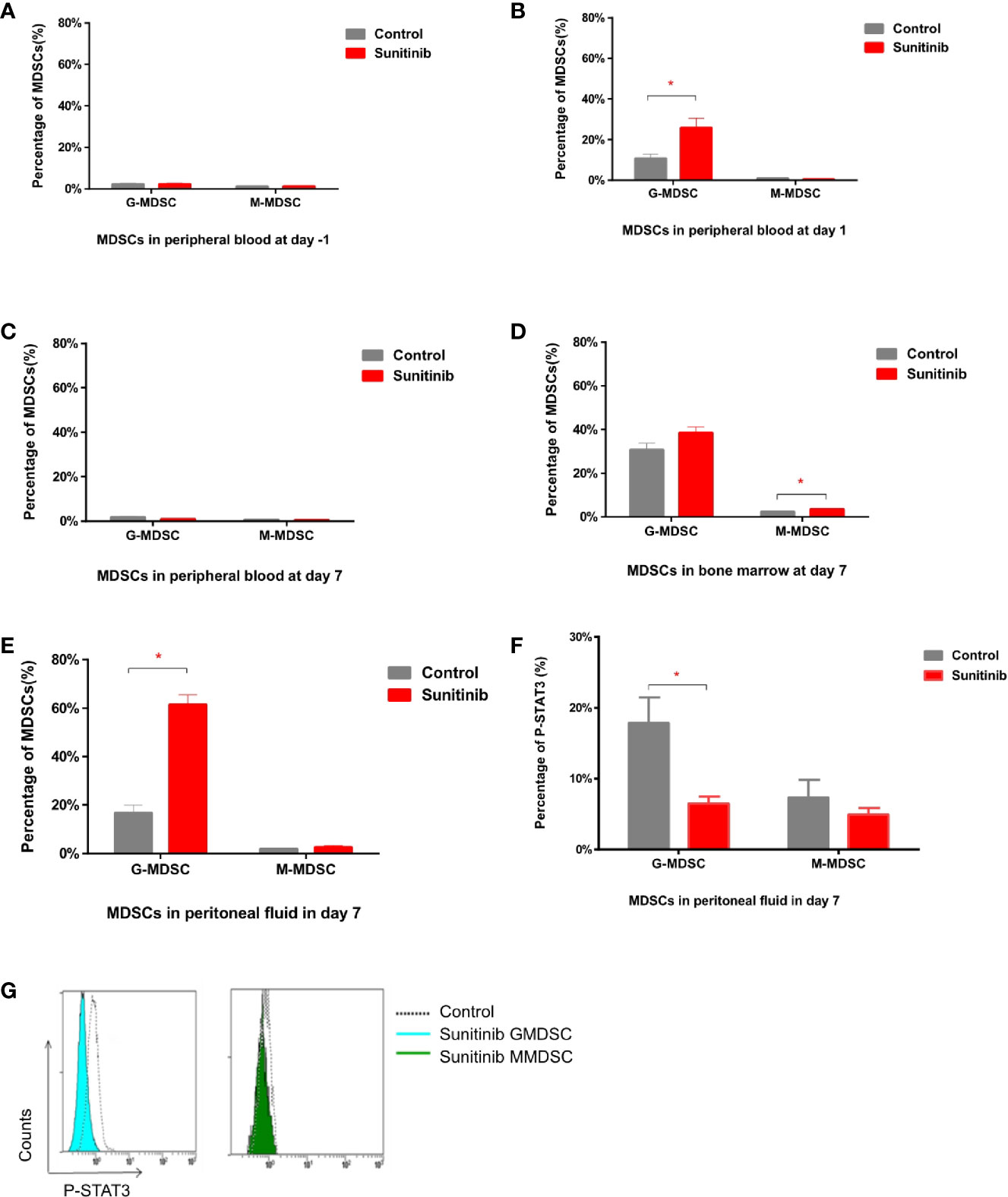 Figure 2 MDSC subsets in peritoneal blood, bone marrow, and peripheral fluid after Sunitinib treatment. (A–C) G-MDSC (defined as CD11b+ Ly6G+ Ly6Clo) and M-MDSC (defined as CD11b+ Ly6G- Ly6Chi) percentage in peripheral blood 1 day before as baseline (day -1), after 1 day (day 1) and 7 days (day 7) of control and Sunitinib treatment. (D, E) G-MDSC and M-MDSC percentage in the bone marrow and peritoneal fluid after 7 days of treatment. (F) Percentage of P-STAT3 in peritoneal G-MDSC and M-MDSC after 7 days of treatment. (G) Representative flow cytometric analyses of intracellular levels of p-Stat3 in peritoneal MDSCs. Data are expressed as the mean ± SEM from 5 animals in each group, *p < 0.05.