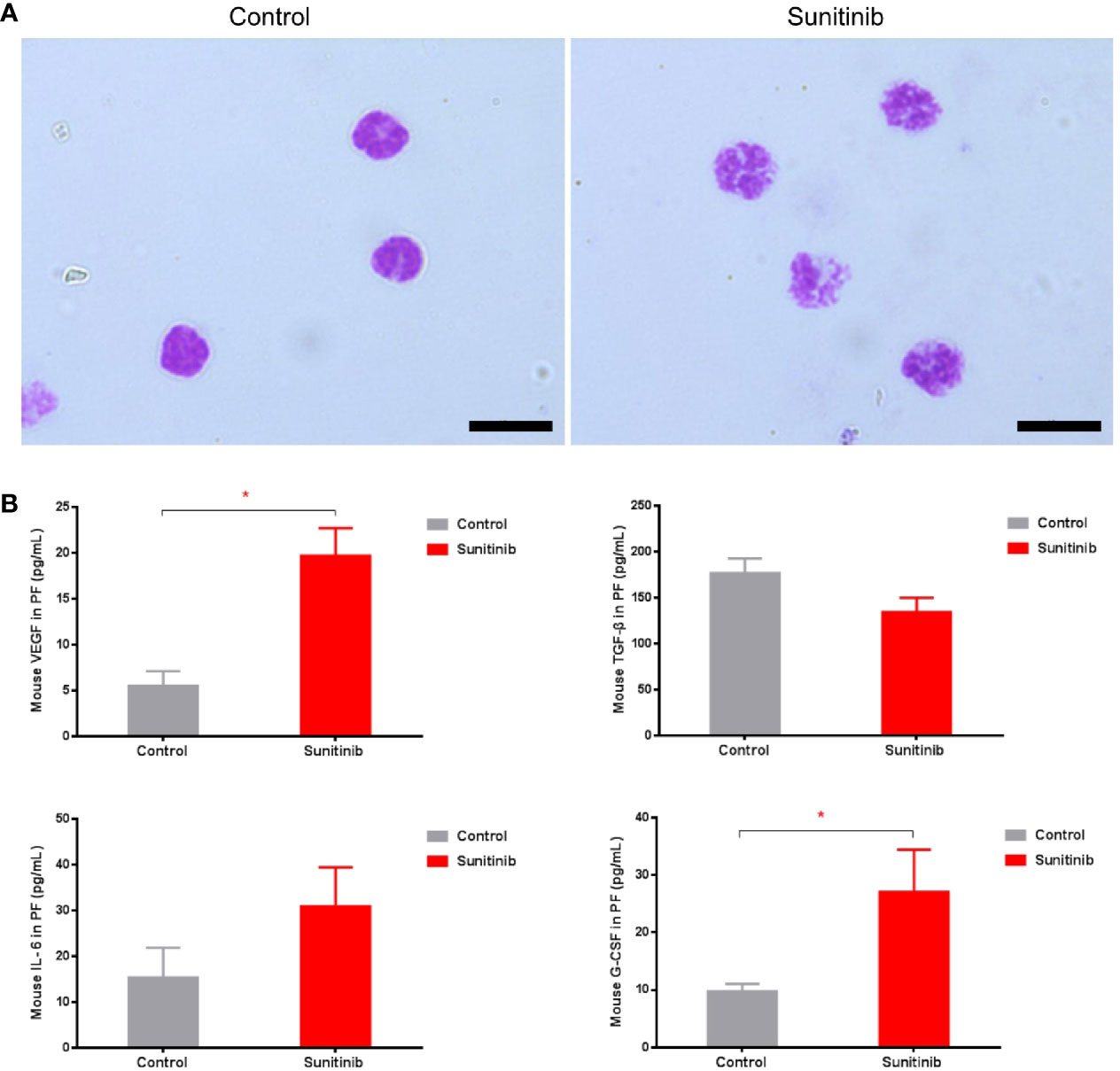 Figure 3 Characteristics of G-MDSC cells and peritoneal cytokine after Sunitinib treatment. (A) Representative Wright-Giemsa staining of isolated peritoneal CD11b+ Ly6G+ G-MDSCs from at least 5 animals in each group after 7 days of treatment, Magnification 1000× Oil, and Scale bar 10μm. (B) Peritoneal cytokines VEGF, G-CSF, IL-6, TGF-β after 7 days of treatment. Data are expressed as the mean ± SEM from 10 animals in each group, *P < 0.05.