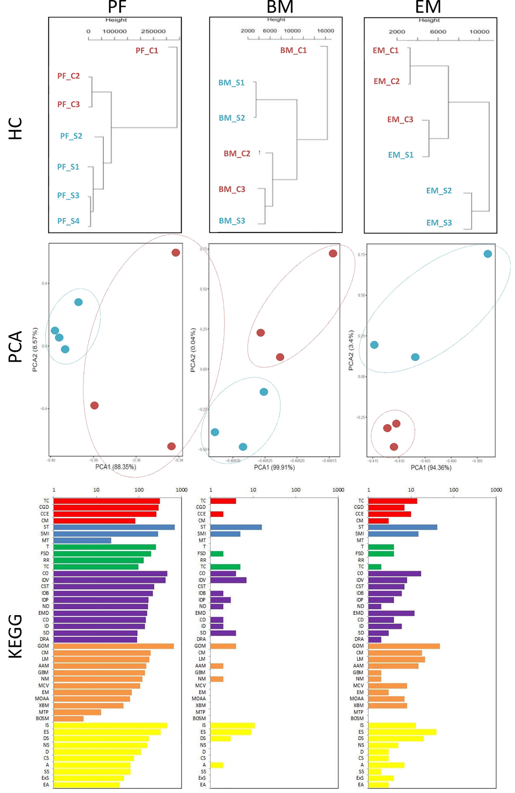 Figure 4 Transcriptomic characteristics of G-MDSC cells and endometriotic lesions. (Upper and middle panels) Hierarchical clustering (HC) and principal component analysis (PCA) of peritoneal (PF) and bone marrow (BM) CD11b+ Ly6G+ G-MDSCs and endometriosis lesions (EM) from 3-4 animals in each group after 7 days of Sunitinib treatment (S in blue labels and dots) versus control (C in red labels and dots). For HC, the closer the samples were to each other, the more similar the expression level was. For PCA, the first and second most coordinated components are shown, similar transcriptomic profiles were grouped by circles. (Lower panels) KEGG Pathway functional enrichment. X axis represents the number of DEG, Y axis represents the functional classification of KEGG according to 7 branches for KEGG pathways: Cellular Processes (red), Environmental Information Processing (blue), Genetic Information Processing (green), Human Disease (purple), Metabolism (orange), and Organismal Systems (yellow). TC, Transport and catabolism; CGD, Cell growth and death; CCE, Cellular community—eukaryotes; CM, Cell motility; ST, Signal transduction; SMI, Signaling molecules and interaction; MT, membrane transport; T, translation; TS, transcription; CO, Cancer—overview; IDV, infectious diseases—viral; CST, Cancers—specific types; IDB, infectious diseases—bacterial; IDP; infectious diseases—parasitic; ND, neurodegenerative diseases; EMD, endocrine and metabolic diseases; CD, cardiovascular diseases; ID, Immune diseases; SD, substance dependence; DRA, drug resistance—antineoplastic; GOM, Global and overview maps; CM, carbohydrate metabolism; LM, Lipd metabolism; AAM, Amnio acid metabolism; Glycan biosynthesis and metabolism; NM, nucleotide metabolism; MCV, Metabolism of cofactors and vitamins; EM, energy metabolism; MOAA, Metabolism of other amnio acids; XBM, Xenobiotics biodegradation and metabolism; MTP, Metabolism of tepenoids and polyketides; BOSM, Biosynthesis of other secondary metabolires; IS, Immune system; ES, Endocrine system; DS, Digestive system; NS, Nervous system; D, Development; CS, Cirrculatory system; A, Aging; SS, Sensory system; ExS, Excretory system; EA, Environmental adaptation.