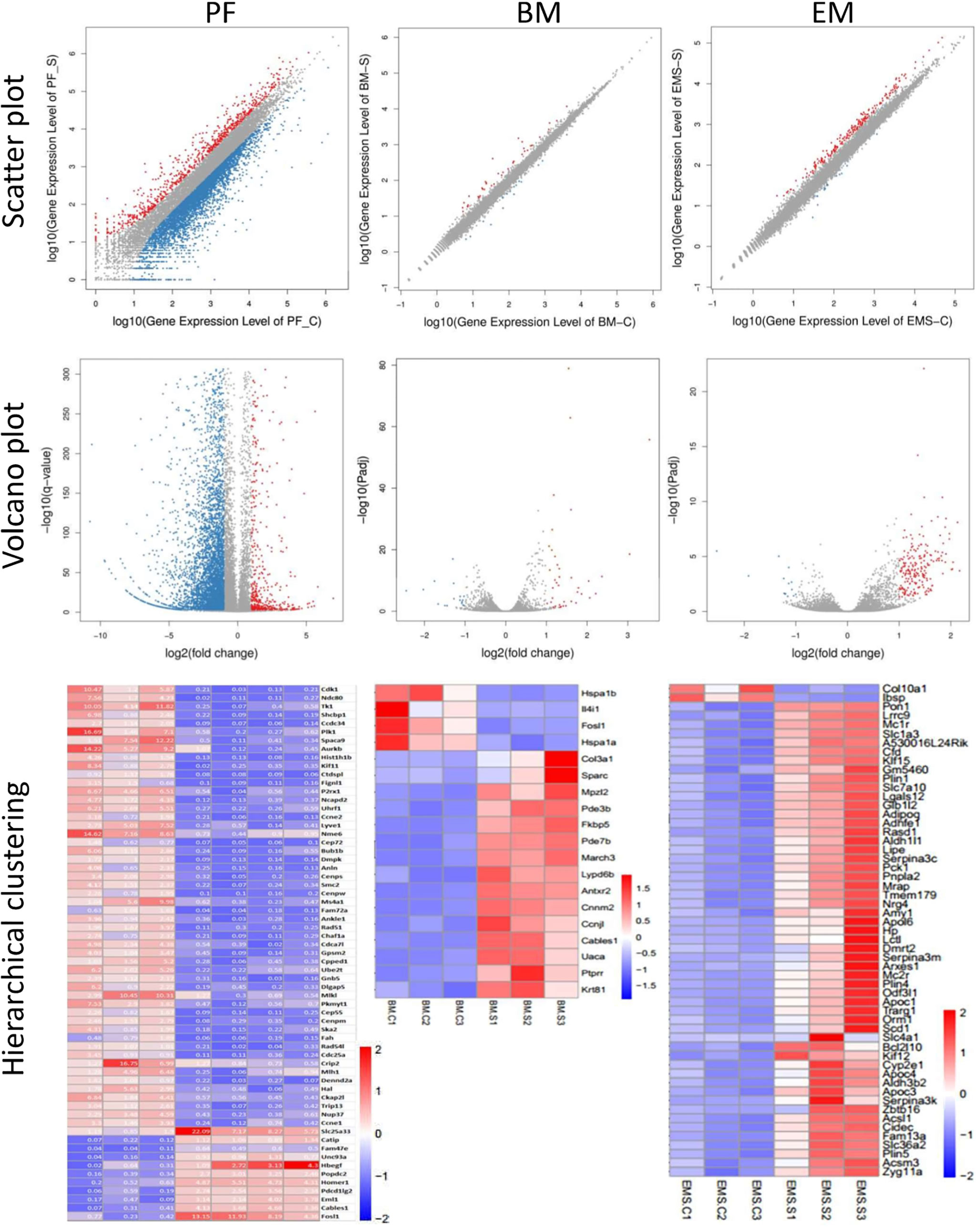 Figure 5 Differential gene expression of G-MDSC cells and endometriotic lesions. (Upper panels) Scatter plots of peritoneal (PF) and bone marrow (BM) CD11b+ Ly6G+ G-MDSCs and endometriosis lesions (EM) from 3-4 animals in each group after 7 days of Sunitinib treatment (S) versus control (C). X Y axis represents log10 transformed gene expression level, red color represents the up-regulated genes, the blue color represents the down-regulated genes, gray color represents the non-DEGs. (Middle panels) Volcano plots of peritoneal (PF) and bone marrow (BM) CD11b+ Ly6G+ G-MDSCs and endometriosis lesions (EM) from 3-4 animals in each group after 7 days of Sunitinib treatment (S) versus control (C). X axis represents log2 transformed fold change. Y axis represents -log10 transformed significance. Red points represent up-regulated DEGs. Blue points represent down-regulated DEGs. Gray points represent non-DEGs. (Lower panels) Heat map of peritoneal (PF) and bone marrow (BM) CD11b+ Ly6G+ G-MDSCs and endometriosis lesions (EM) from 3-4 animals in each group after 7 days of Sunitinib treatment (S) versus control (C) by hierarchical clustering. X axis represents the sample. Y axis represents the DEGs. The color represents the log2 transformed gene expression level. The dark color means the high expression level while the light color means the low expression level. The most significant differentially expressed genes (p < 0.05, padj < 0.05 or q < 0.01, and also fold changes > 1.5-5) are shown. The full list and statistical analysis are available in corresponding Supplementary Tables 1–3.