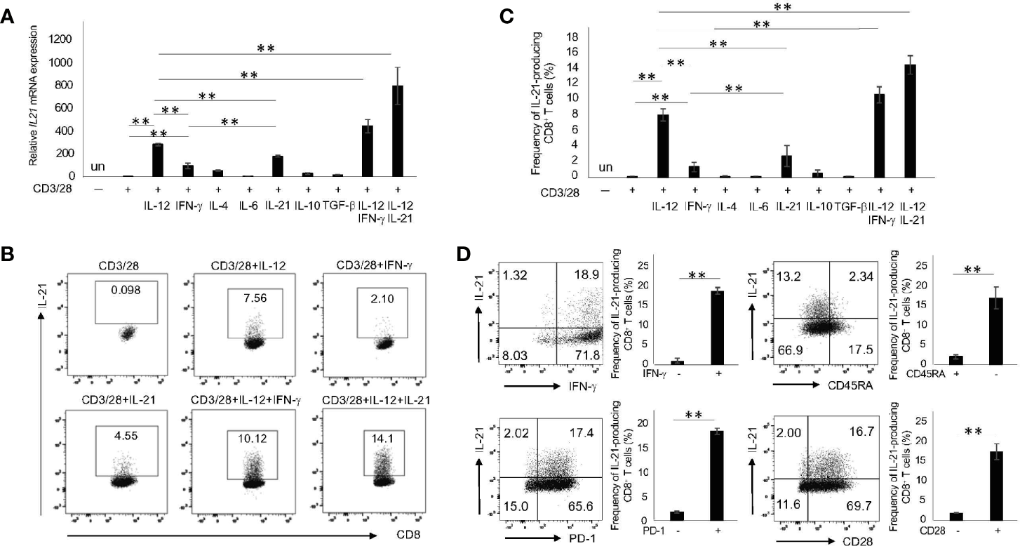 IL-21-producing CD8+ T cells are most efficiently induced by IL-12 and IL-21 in combination with CD3/28. (A) Naïve CD8+ T cells (CD45RA+CCR7+ CD8+ T cells) in HCs were purified by flow cytometry and then stimulated with the indicated cytokines in combination with CD3/28 beads for 72 h. Cells were harvested, and transcriptions of IL21 were evaluated by qPCR. (B) Purified naïve CD8+ T cells in HCs were stimulated with the indicated cytokines for 5 days, and IL-21 production was analyzed by intracellular staining. Representative data are shown and summarized results are shown in (C) (N=4). (D) Naïve CD8+ T cells in HCs were stimulated with IL-12 and IL-21 in conjunction with CD3/28 beads. The panels show expression of CD45RA, PD-1, CD28 and IFN-γ on IL-21+ and IL-21- CD8+ T cells. Representative data are depicted, and summarized graphs of the results are shown (N=4). **P < 0.01, un, undetected.