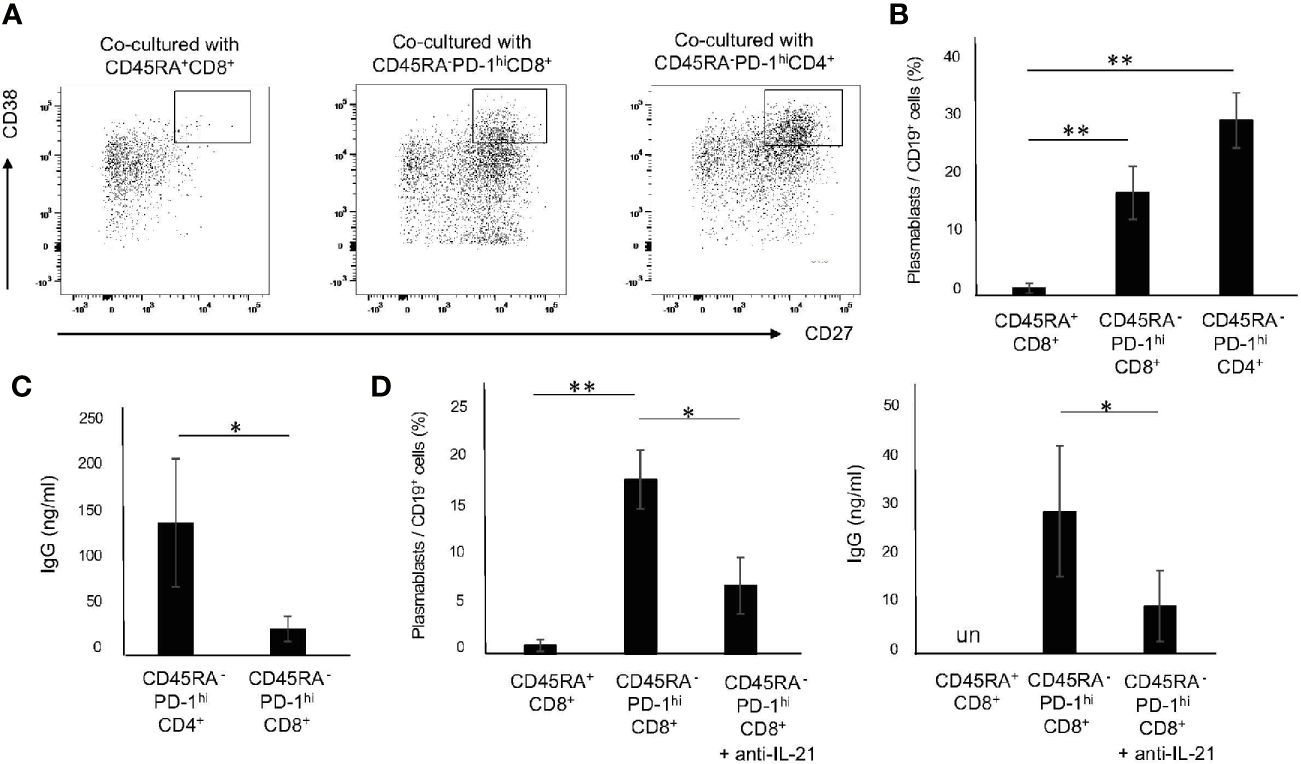 Memory PD-1hiCD8+ T cells promote the differentiation of B cells to plasmablasts and IgG production in an IL-21-dependent manner. (A) Upon stimulation of PBMCs from HCs with CD3/28 beads for 72 h, CD45RA+CD8+ T cells, CD45RA- PD-1hi CD8+ T cells and CD45RA- PD-1hi CD4+ T cells were purified by flow cytometry. Memory B (CD19+CD20+CD27+) cells were co-cultured with CD45RA+ CD8+ T cells, CD45RA-PD-1hi CD8+ T cells and CD45RA- PD-1hiCD4+ T cells in the presence of anti-BCR, CD3/28 beads and CpG for 6 days. Representative data on the expression of CD27 and CD38 are depicted in (A) and the results are summarized in (B) (N=4). (C) Comparison of IgG production from plasmablasts induced by co-cultured CD45RA-PD-1hiCD4+ T cells and CD45RA-PD-1hiCD8+ T cells. (D) Effect of IL-21 blockade on the frequency of plasmablasts and IgG production induced by co-cultured CD45RA-PD-1hiCD8+ T cells. *P < 0.05, **P < 0.01. un, undetected.