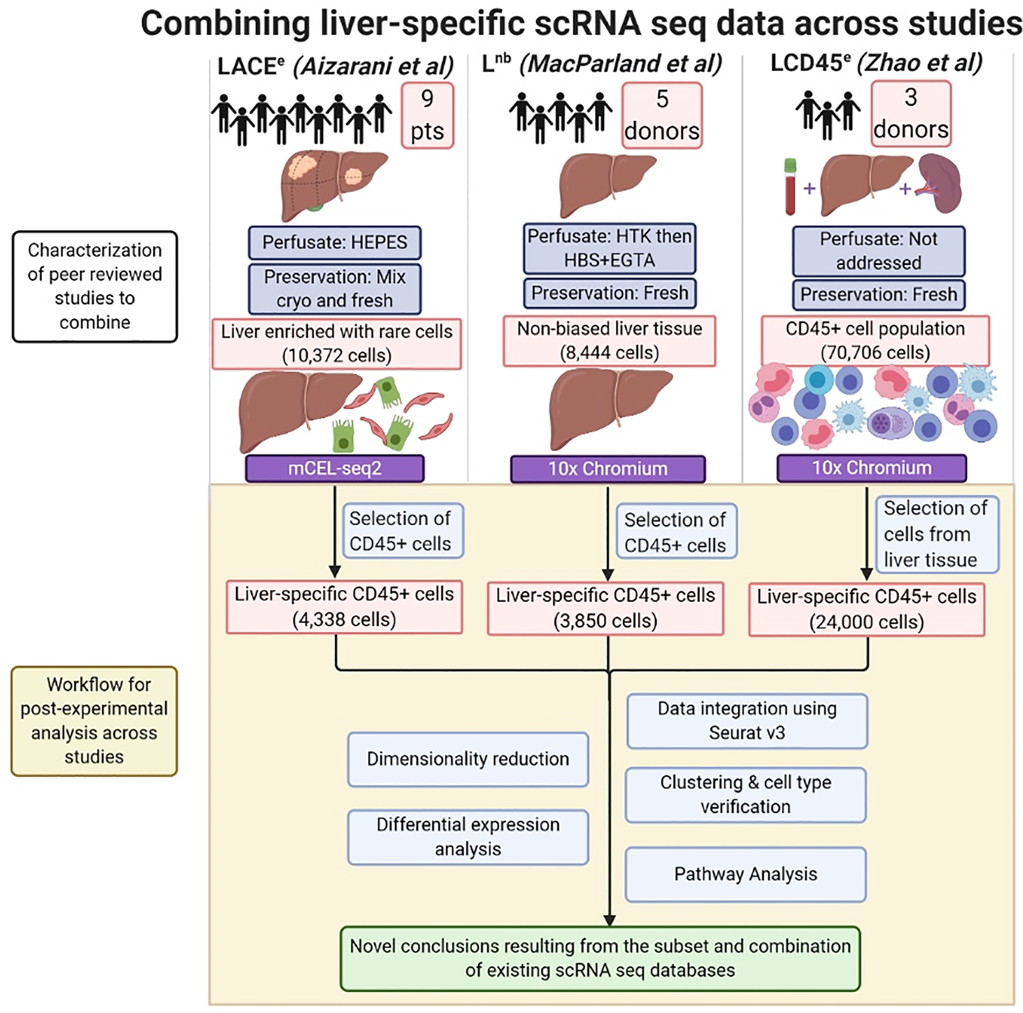 Combining liver-specific scRNA seq data to create a human liver immune meta-atlas. Schematic diagram summarizing the number of subjects and major pre-analytical variables pertaining to scRNA sequencing of human liver. Post-experimental analysis performed in this study is highlighted in the shaded region. CD45+ cells were selected from the LACEe and Lnb studies. CD45+ cells (which were already pre-selected for in the LCD45e dataset) which were of liver origin were post-experimentally extracted as splenic and peripheral blood cells were also included in the original dataset. The scRNA seq analysis pipeline (Seurat v3 in R) was applied, then clustering and differential expression analysis were used to assess the ability to combine scRNA seq techniques and generate datasets for tertiary pathway analysis of immune function in the normal human liver. Created with BioRender.com.