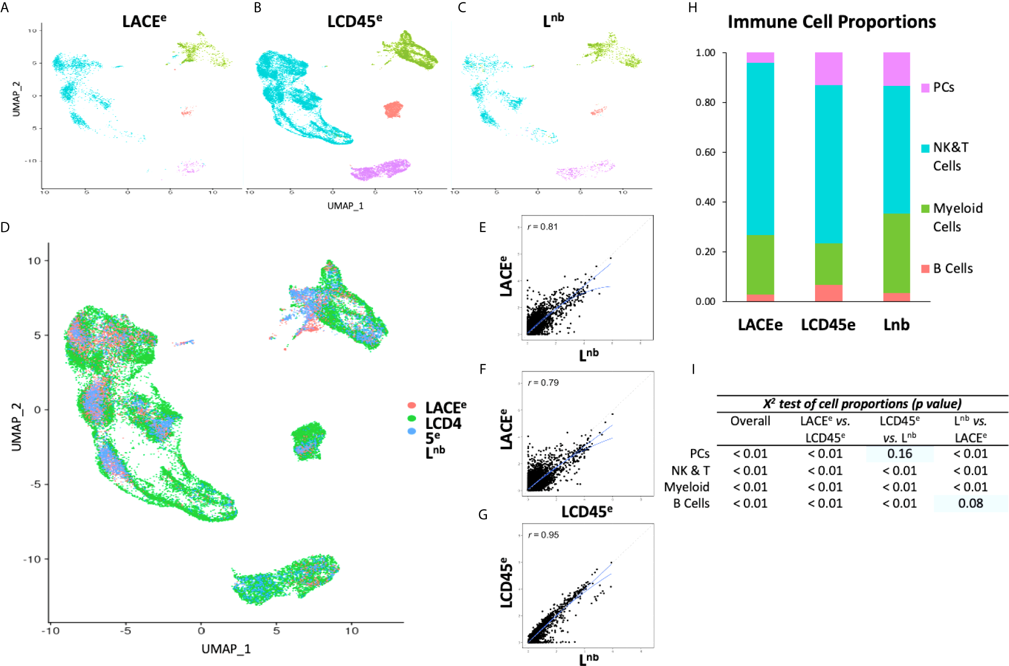 Data visualization with clustering and gene expression correlation between datasets. (A–C) UMAP plots of individual studies. (D) Plot showing co-clustering of three single cell datasets. (E–G) Gene expression correlation plots with solid lines showing linear and quadratic regressions. Dashed line representing idealized relationship. (H) Bar graph representation of immune cell proportions of each individual dataset. (I)X2 comparison showing significant differences in proportions of immune cell subpopulations. With pairwise analysis, most chi-squared values reached statistical significance except for plasma cells in LCD45e versus Lnb and for B Cells in Lnb versus LACEe (indicated by blue rectangles).