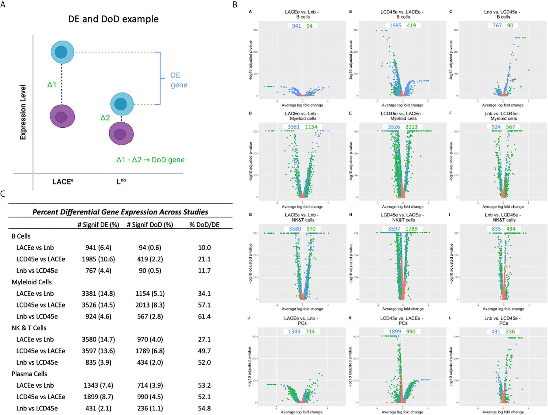 Analysis was then performed between datasets in order to quantify how many genes were DE in each immune cell subpopulation (Figure 3B). In this analysis, DE genes with a fold change ratio <0.8 or >1.25 and a Bonferroni corrected p-value <0.05 are represented in volcano plots and compare individual gene expression level within an immune cell subpopulation, between datasets (16). Some comparisons yielded a high number of DE genes between datasets (e.g., 3526 genes when comparing LCD45e and LACEe in myeloid cells). In contrast, when comparing the Lnb dataset to the LCD45e dataset among the B cell population, there were only 767 DE genes and the myeloid cell population between these two datasets had 924 DE genes, again demonstrating fewer expression differences between Lnb and LCD45e relative to LACEe.