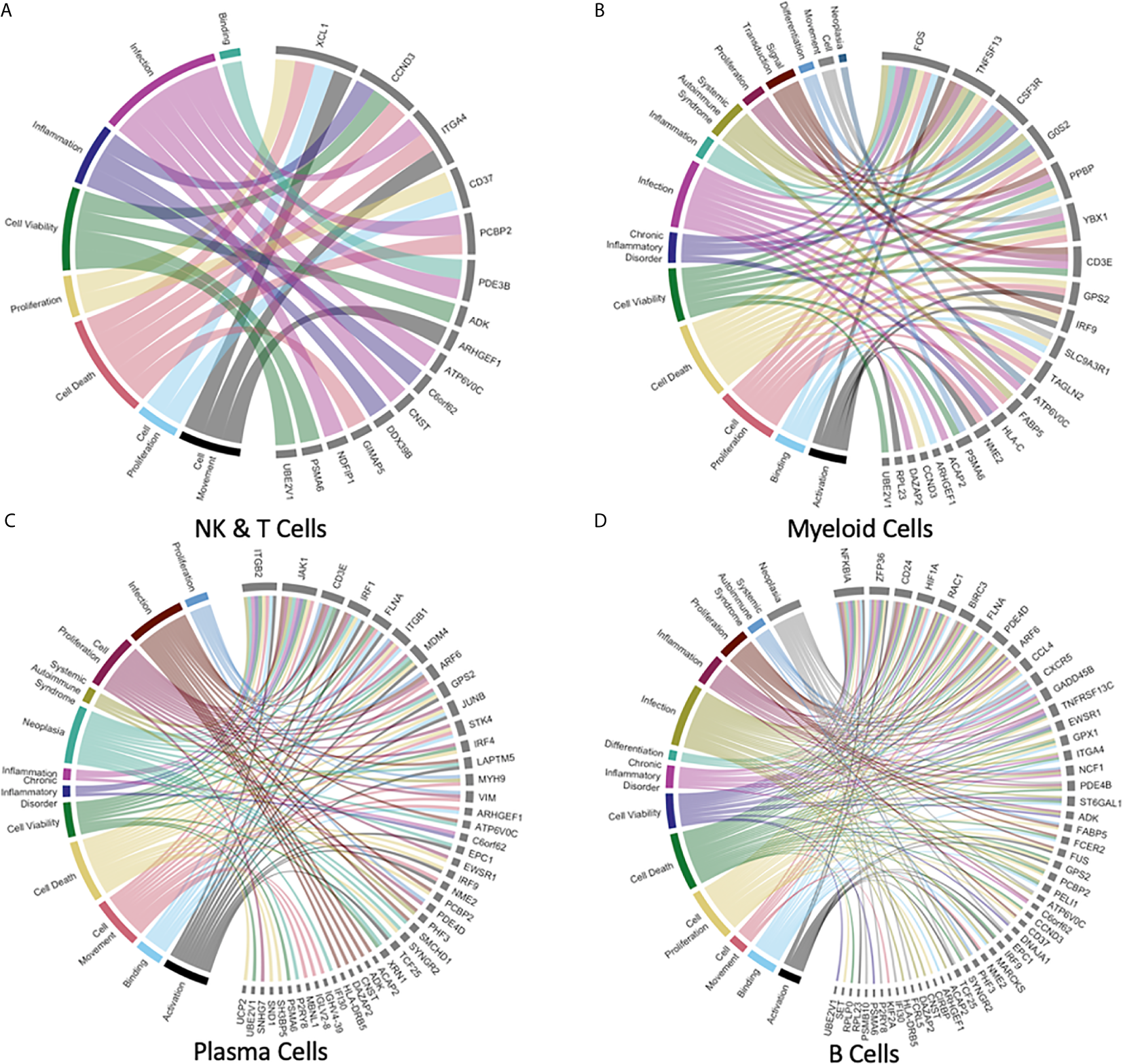 Pathway analysis output generated characterizations of various cellular biochemical functions. Functions were sub-divided into types including Systemic Autoimmune Syndrome, Signal Transduction, Proliferation, Neoplasia, Inflammation, Infection, Differentiation, Chronic Inflammatory Disorder, Cell Viability, Cell Death, Cell Proliferation, Cell Movement, Binding, and Activation. Z-score values of whether expression was upregulated or downregulated were used to establish a functionality signature for each cell type. Specifically, these pathway analysis data were then transferred for further tertiary analysis in R using the Circlize package to produce meta-signatures as chord plots which relate specific cell functions to individual genes having differential expression. In order to reduce complexity of the figures, redundant cell functions and functions related to disease states noted to be irrelevant to immune subpopulations were excluded. The resulting chord diagrams link genes associated with specific cellular functions, allowing for visualization of the immune phenotype for each leukocyte subpopulation (Figure 6).