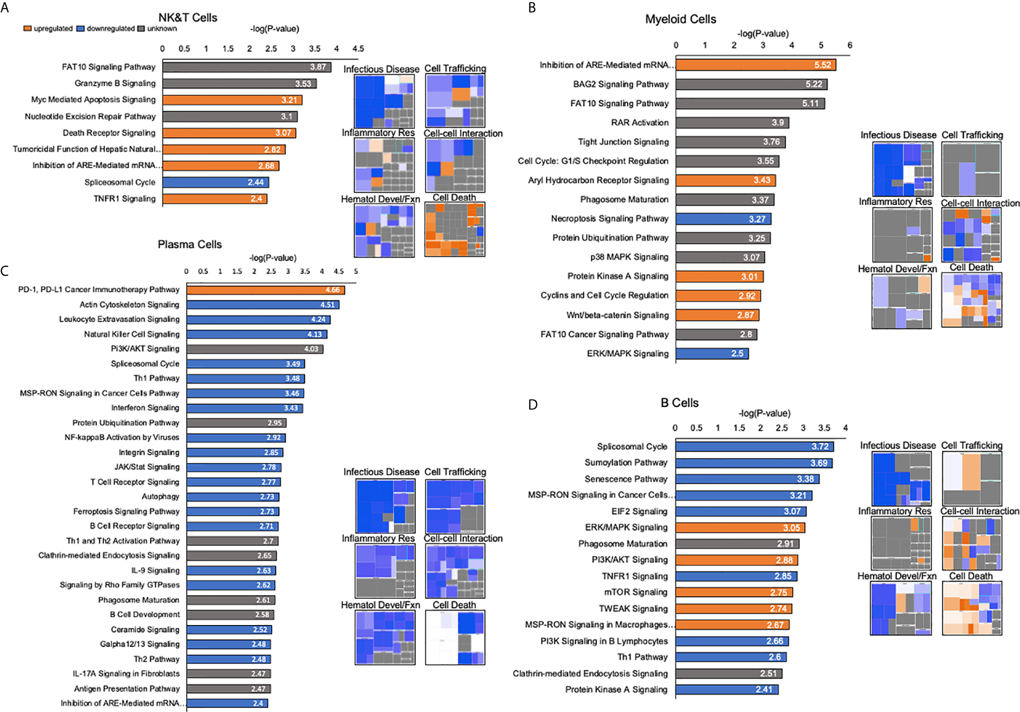 Detailed pathway analysis of human liver immune meta-atlas shows selective upregulation of death-related transcripts and downregulation of immune-related cell functions. (A) Pathway analysis of NK and T cells based on differential expression between human liver meta-atlas versus normal human PBMC. Histograms showing -log(P-value) corresponding to the significance of the involved signaling pathway. Orange corresponds to upregulated pathways, blue shows downregulated pathways and gray corresponds to unknown directionality based on Ingenuity Knowledge Base. Heatmaps showing perturbations in specific functions of NK and T cells in the human liver relative to PBMC. (B) Myeloid Cell pathway analysis showing canonical pathway functioning in human liver relative to human PBMCs. Heatmaps of specific functions within Myeloid cells relative to PBMCs. (C) Canonical pathway functioning Plasma Cells of the human liver relative to PBMC with associated heatmap of specific functions. (D) B Cell pathway analysis with histograms showing canonical pathways and heatmaps highlighting specific cellular functions in liver relative to PBMC.