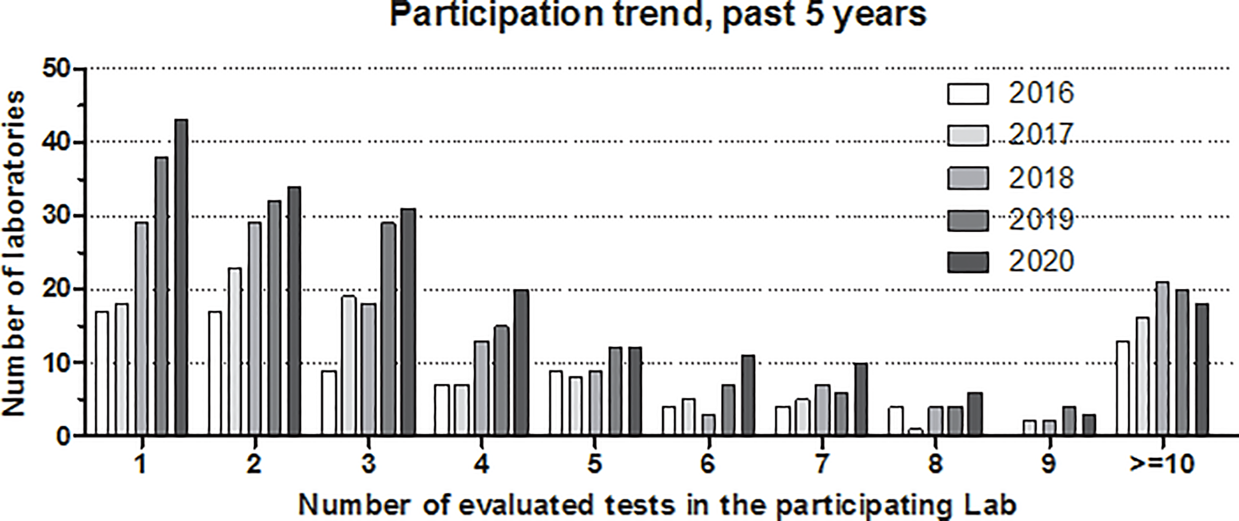 Figure 2 Number of participating laboratories in the external quality assurance program of diagnostic complement laboratories. Participation trends in the past 5 years (2016–2020) are shown separately by the number of tests evaluated in the given laboratory. Note: laboratories participating with more than nine tests are merged as “≥10.”.