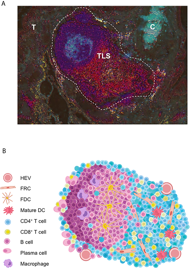 A number of reports highlights growing evidence on that the development of anti-tumor immune responses at the tumor sites within organized lymphoid structures called TLS that act as local hubs where the immune response can be generated. Initially evidence in the context of autoimmune pathologies, TLS comprise the various cellular components needed to develop an adaptive anti-tumor response. They exhibit a T-cell zone containing activated T cells with Th1, cytotoxic or memory phenotypes, mature dendritic cells (DC) involved in antigen presentation, and fibroblastic reticular cells (FRC) (Figures 1A, B). A B-cell zone is also present, exhibiting a germinal center (GC) and where memory B cells and plasma cells can be detected (3, 4). On one hand, detailed cellular content and organization of ectopic lymphoid aggregates have been described, leading to the view that TLS neogenesis is a complex process that gives rise to different types of lymphoid aggregates until a fully differentiated TLS is generated. On the other hand, important features of TLS in cancer patients that have also brought new insights in their relationship with clinical status and tumor characteristics, as described below.