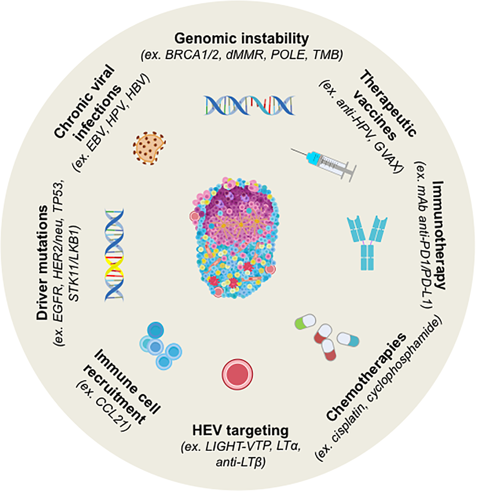 Figure 2 Strategy for Induction of TLS neogenesis in human cancers and by cancer treatments. TLS are induced by chronic viral infections to which tumorigenesis has been associated with genomic instability and/or peculiar driver mutations in several tumors. Chemotherapy, immunotherapy or therapeutic vaccination can also induce TLS. In most cases, their presence is concomitant to better prognosis and higher clinical responses to treatments. Murine models have been explored for the induction of TLS by targeting HEV or the cells involved in organogenesis (i.e. CCL21). BRCA1/2, Breast cancer 1 and 2; dMMR, Deficient Mismatch Repair; EBV, Epstein-Barr Virus; EGFR, Epidermal Growth Factor Receptor; GVAX, GM-CSF-secreting allogeneic PDAC vaccine; HPV, Human Papillomavirus; LIGHT-VTP, LIGHT (stands for homologous to lymphotoxin)-Vascular Targeting Peptide; LKB1, Liver kinase B1; LTα, lymphotoxin alpha; LTβ, lymphotoxin beta; OSCC, Oral Squamous Cell Carcinoma; PDAC, pancreatic ductal adenocarcinoma; POLE, DNA Polymerase Epsilon, Catalytic Subunit; STK11, Serine Threonine Kinase 11; TMB, Tumor Mutational Burden.