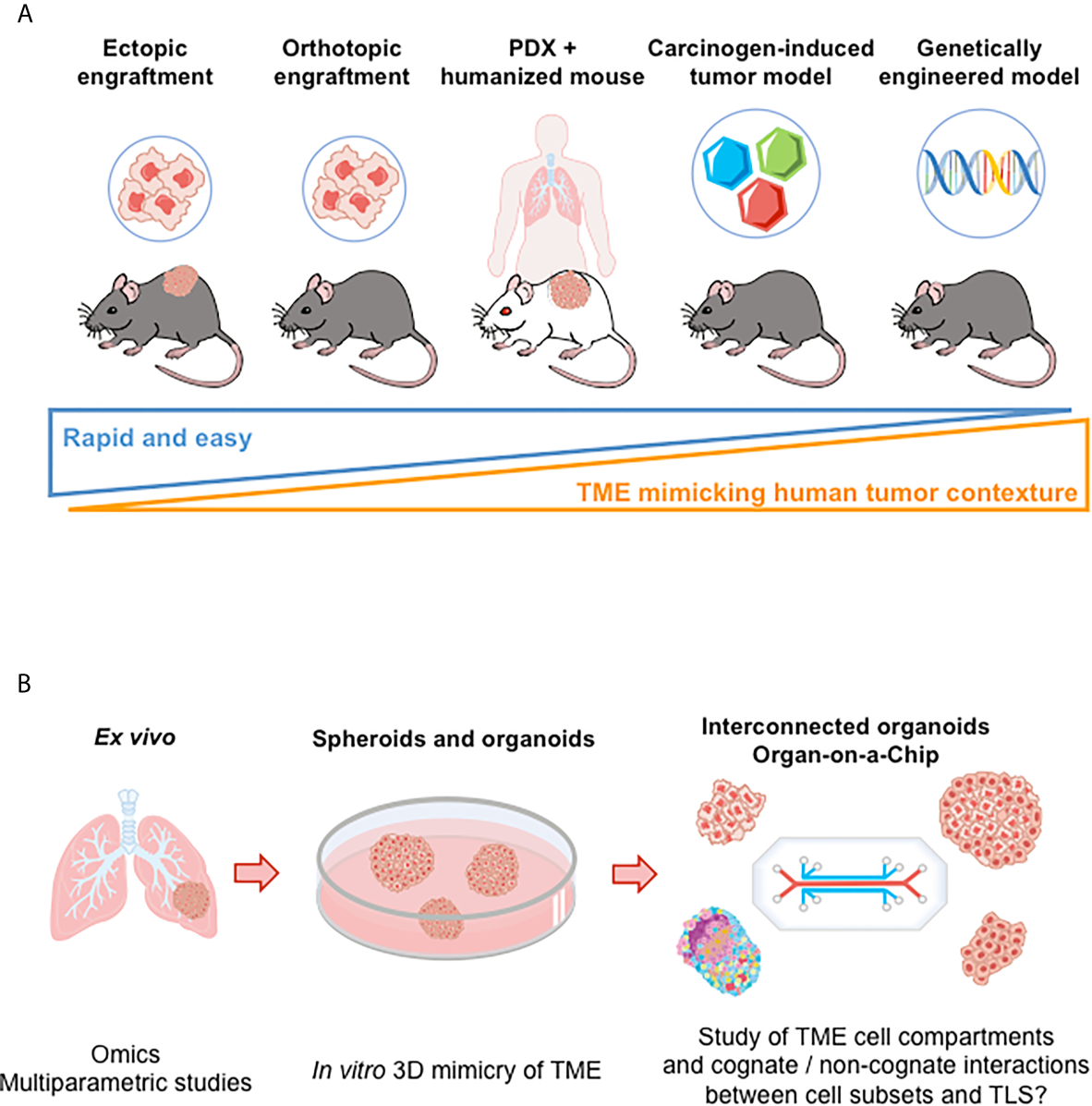 Figure 3 Preclinical models for the study of TLS. (A) Illustration of murine models to investigate of TLS neogenesis and immune function. From the left to the right: i) Ectopic models consist in implanting syngeneic tumor cells in immunocompetent mice (subcutaneous injection). However, tumor microenvironment poorly recapitulates the immune contexture of the originating tissue; ii) Intravenous injection of tumor cells allow tumor cells to disseminate in various tissues. But TLS study is hard to perform (kinetics of tumor growth and of TLS neogenesis to be mastered); iii) Implanting tumor cells directly into the tissue from which they originate (orthotopic models) allows tumor growth in a more physiological relevant microenvironment but without rapid dissemination; iv) Patient-Derived Xenotransplantation (PDX) tumor models that use immunodeficient mice enable a better maintenance of tumor heterogeneity but do not allow to investigate anti-tumor immune responses. Mice repopulated with human immune cells (“humanized mice”) can be used; v) Carcinogen-induced and genetically engineered tumor models better mimic the clinical situation. Tumors develop spontaneously and gradually in the targeted tissue, allowing for progressive immune microenvironment formation. However, an important variability in tumor development is observed (requirement for large numbers of animals to conduct experiments). (B) Ex vivo and in vitro models, as illustrated in lung cancer. Tumor explants enable to perform multiparametric cytometry and/or imaging, bulk or single cell RNAseq, providing data on the cellular and molecular content of TME. Spheroid and organoid cultures derived from tumor tissues allow the study of TME cellular components (or even of more complex structures such as TLS in a near future following recent progress in organoid and interconnected organoid techniques) (82). “Organ-on-a-Chips” (i.e., microfluidic tissue chips) devices make it possible to study the interaction between TME cell compartments (tumor, stromal, and immune cells). TME, tumor microenvironment.