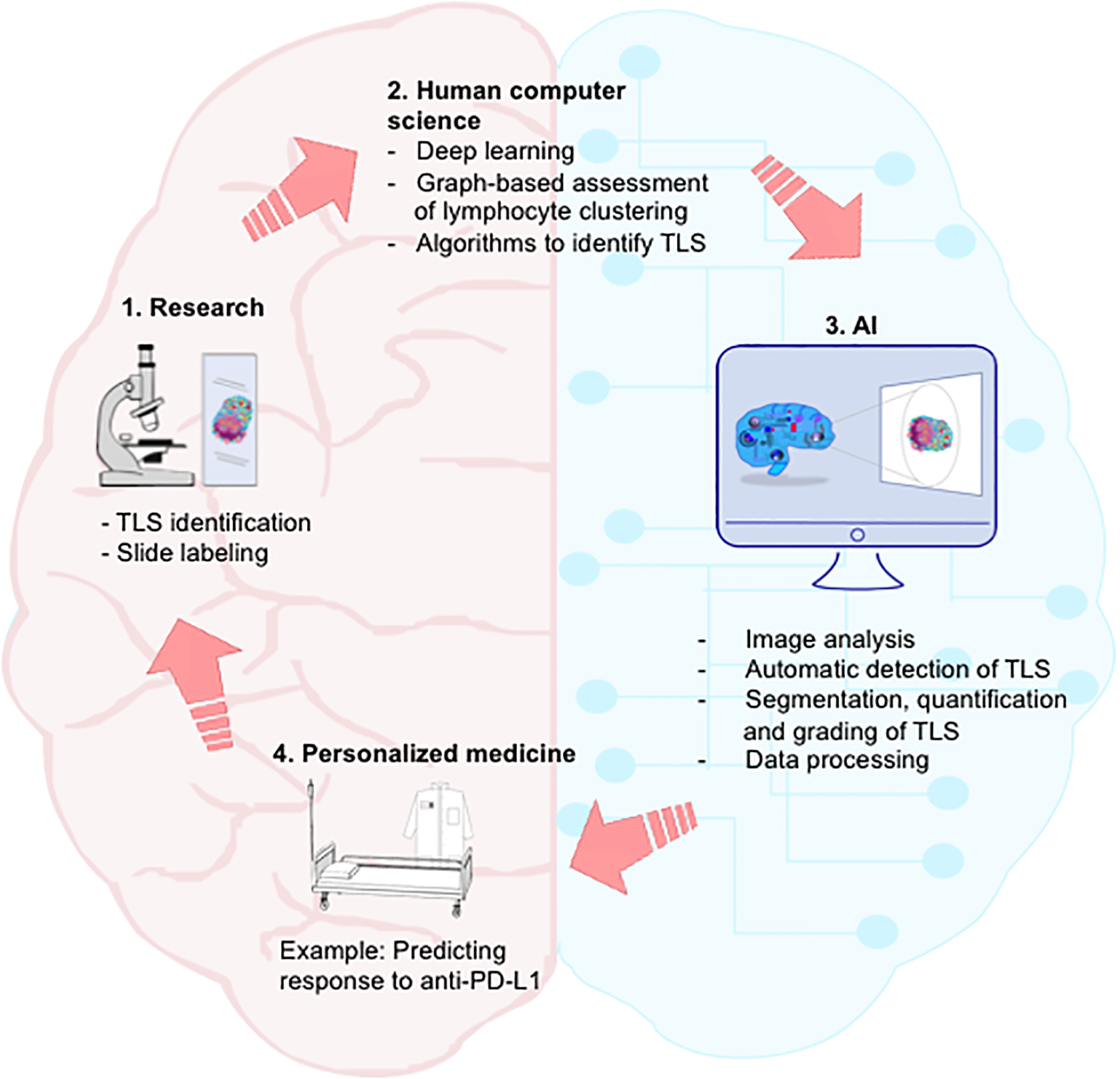 Figure 4 Integration of AI in the continuum of medicine. Streamlined dialogue between human and computer may accelerate path from laboratory discovery on TLS to clinical application and personalized medicine. Step 1. Researchers and clinicians identify TLS on labeled slides. Step 2. Computer scientists develop algorithms allowing machine-learning for automatic identification of TLS. Step 3. AI performs segmentation, quantification and grading of TLS, as well as big data processing. Step 4. By integrating computerized medical data into the therapeutic decision, anticipation of clinical responses (in particular following anti-PD-L1 therapy) and development of personalized medicine would become possible. AI, artificial intelligence.