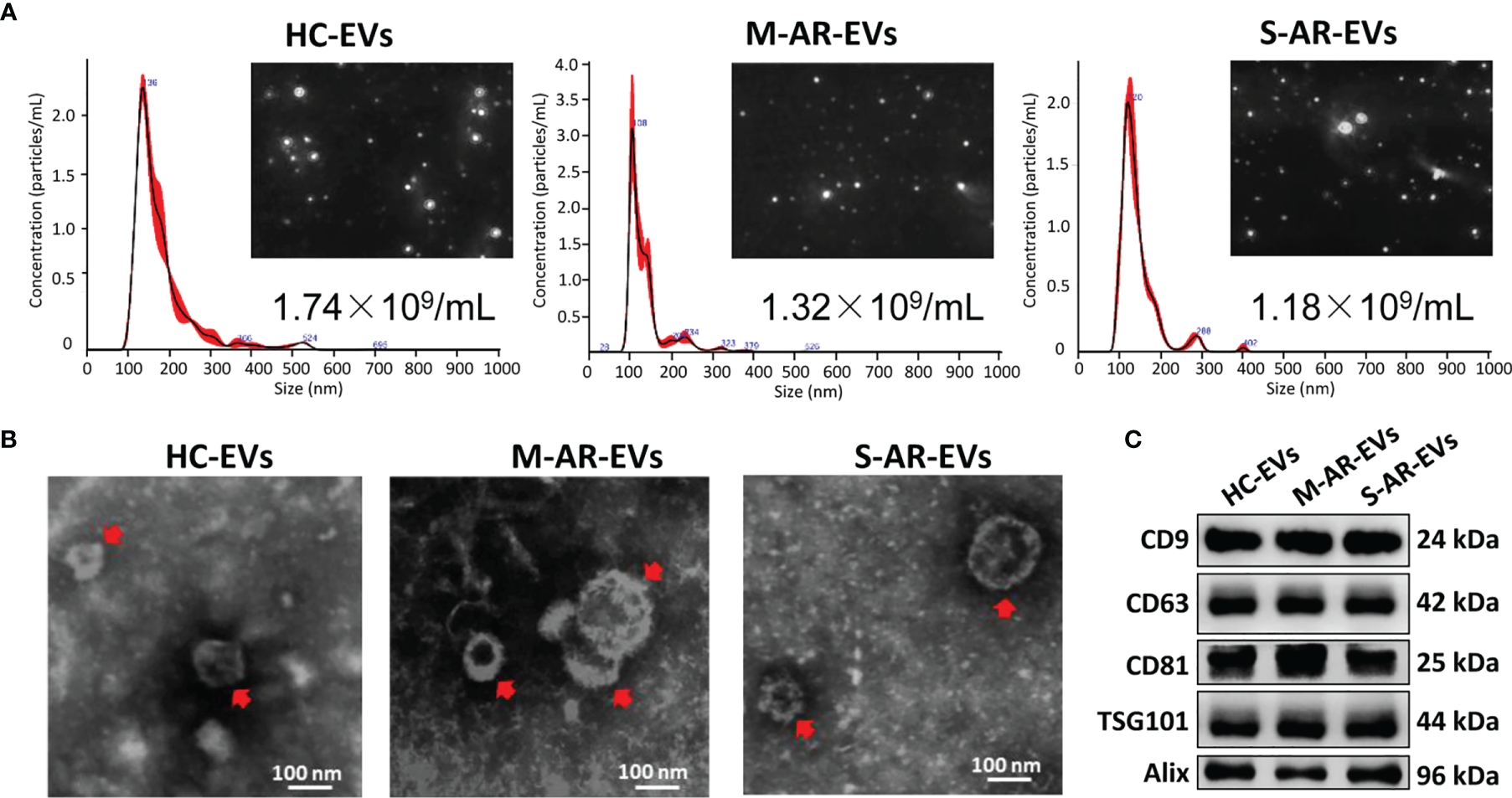 Characterization of plasma EVs. (A) Nanoparticle tracking analysis for determination of the particle numbers and size distribution of plasma EVs. (B) Transmission electron microscopy for characterization of the morphology of plasma EVs. (C) Plasma EVs isolated from HC subjects and patients with M-AR and S-AR were positive in the expression of specific EV markers. HC, Healthy control; M-AR, Mild allergic rhinitis; S-AR, Moderate-severe allergic rhinitis.