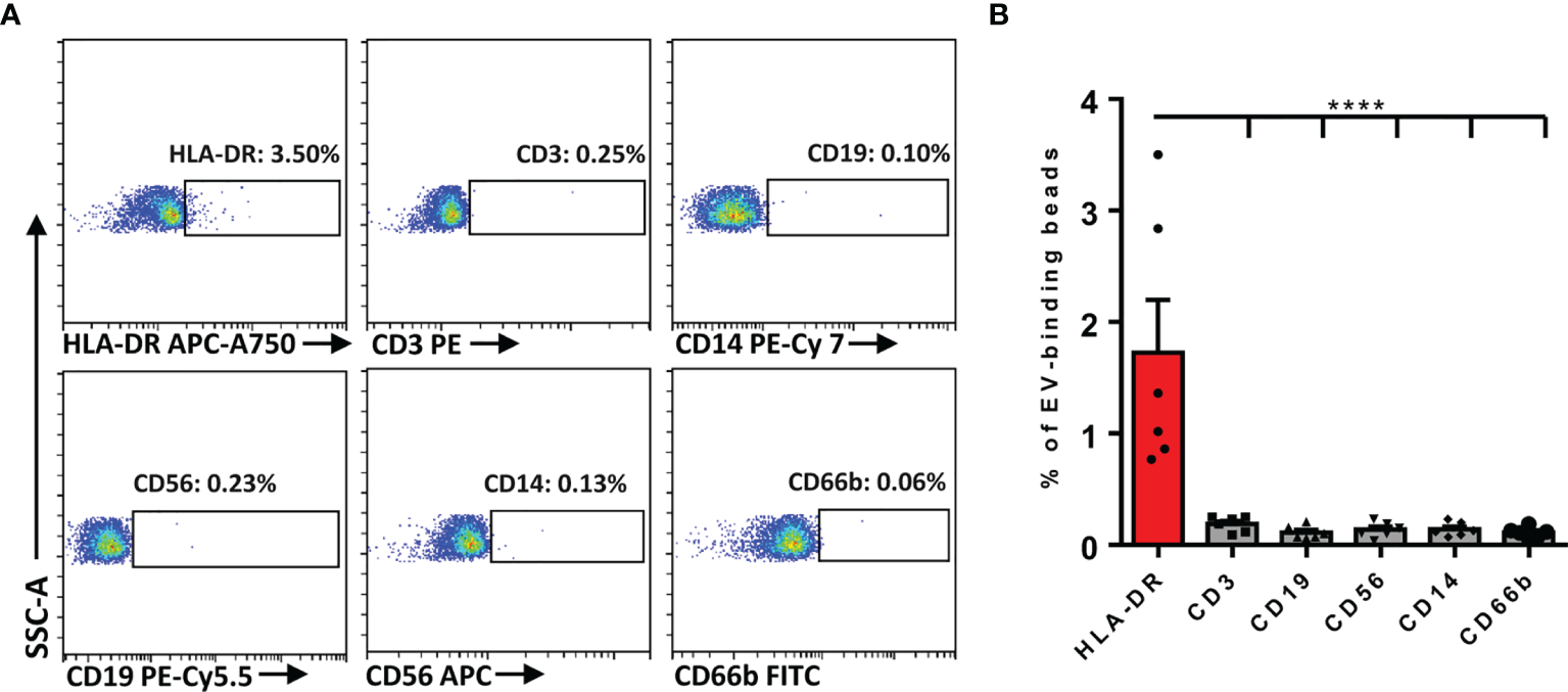 Determination of the immunocyte-associated markers on plasma EVs of AR patients. (A) Representative dot plots for flow cytometry analysis of immunocyte-related markers on plasma EVs. (B) Flow cytometry analysis of the expression of immunocyte-related markers on plasma EVs. Data are shown as mean ± SEM. ****p < 0.0001 by one-way ANOVA multiple comparison.
