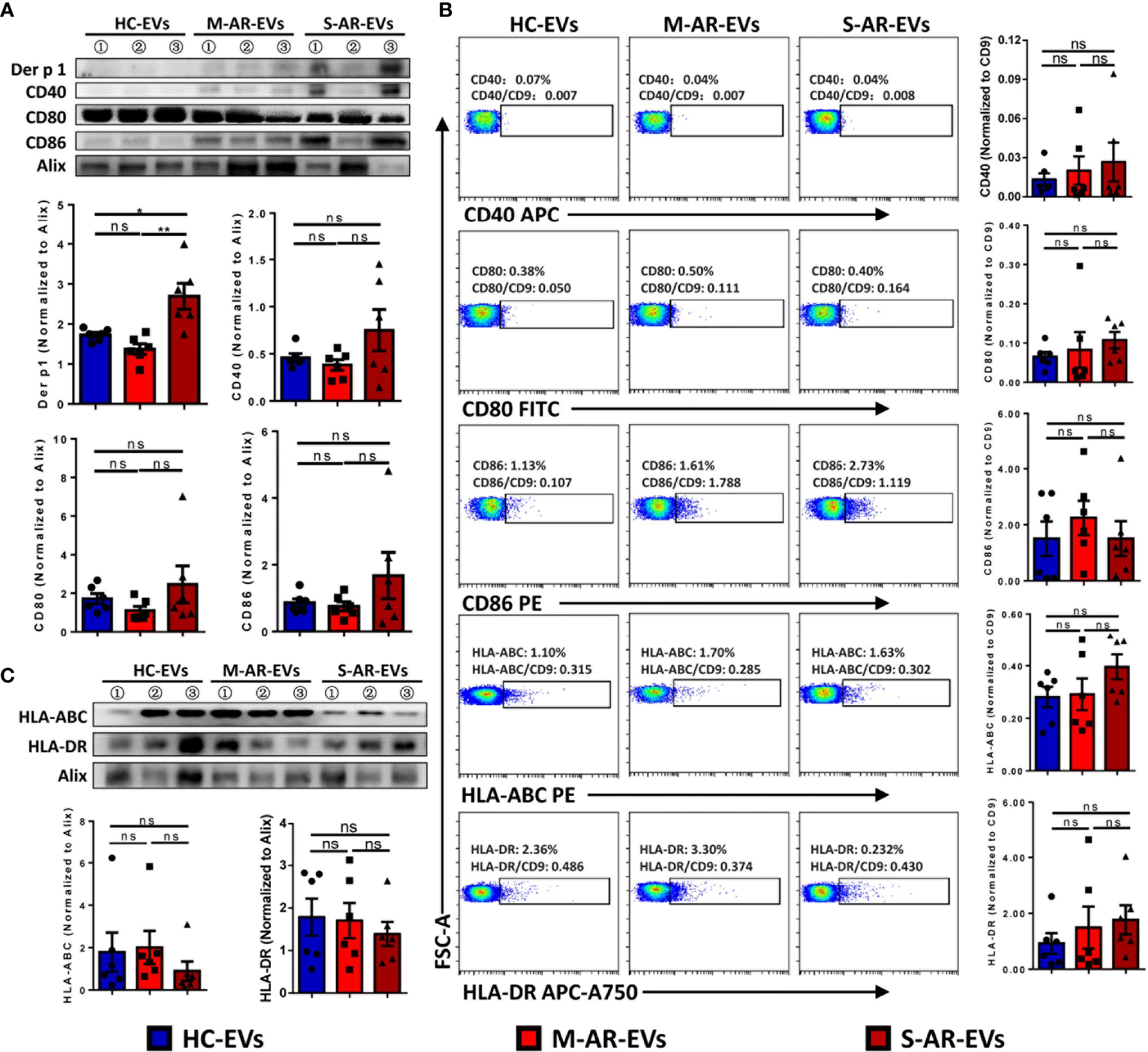 Determination of Der p 1, costimulatory molecules, and antigen presentation molecules on plasma EVs. The expression of costimulatory molecules (A) and antigen presentation molecules (B) was similar among plasma EVs derived from HC subjects and patients with M-AR and S-AR, while the expression of Der p 1 was significantly higher in patients with S-AR, as determined by Western blot. (C) No significant difference was found on levels of costimulatory and antigen presentation molecules on plasma EVs derived from HC subjects and patients with M-AR and S-AR, as suggested by flow cytometry analysis. EVs, Extracellular vesicles; HC, Healthy control; M-AR, Mild allergic rhinitis; ns, no significance; S-AR, Moderate-severe allergic rhinitis. Data are shown as mean ± SEM. Western blot of Der p 1, CD40, CD80, and CD86, as well as flow cytometry analysis of CD86 and HLA-ABC, were analyzed by Mann–Whitney U test; the other data were analyzed by one-way ANOVA multiple comparison. *p < 0.05. The data were combined from two independent experiments.
