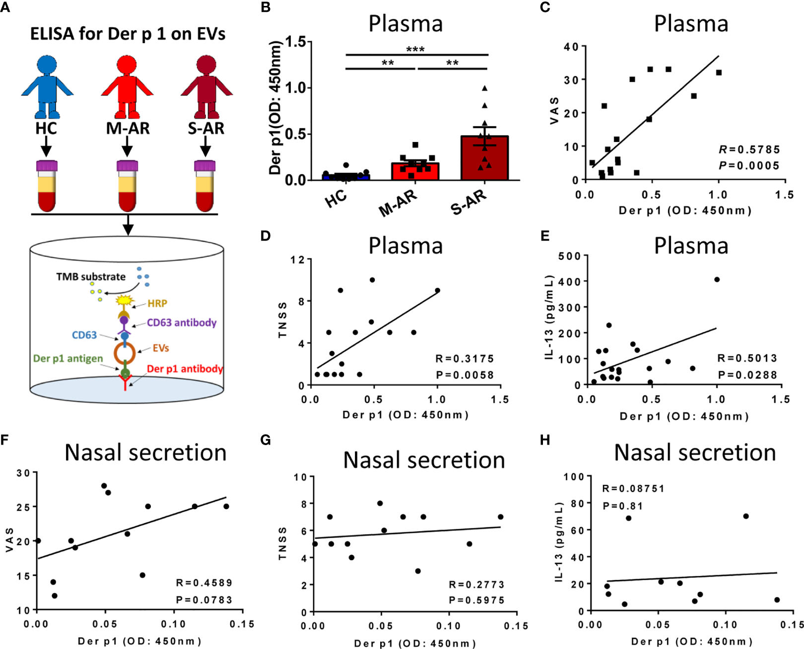 Detection of Der p 1-carrying EVs and the correlation between Der p 1+ EVs with the signs of the diseases and level of IL-13 in AR patients. (A) Schematic diagram of the ELISA for detection of Der p 1 on plasma EVs. (B) Levels of Der p 1 in patients with M-AR and S-AR were both significantly higher than HC subjects, as determined by ELISA. (C–E) Level of plasma EV-bearing Der p 1 in AR patients was significantly correlated with the VAS score (C), TNSS score (D), and level of IL-13 in plasma (E). (F–H) Level of Der p 1 on nasal secretion-derived EVs in AR patients has no significant correlation with VAS score (F), TNSS score (G), and level of IL-13 in nasal secretion (H). ELISA, Enzyme-linked immunosorbent assay; EVs, Extracellular vesicles; HC, Healthy control; M-AR, Mild allergic rhinitis; S-AR, Moderate-severe allergic rhinitis; TNSS, Total nasal symptom score; VAS, Visual analogue scale. **p < 0.01, ***p < 0.001 by one-way ANOVA multiple comparison. Correlation analyses were performed using Pearson correlation coefficient.