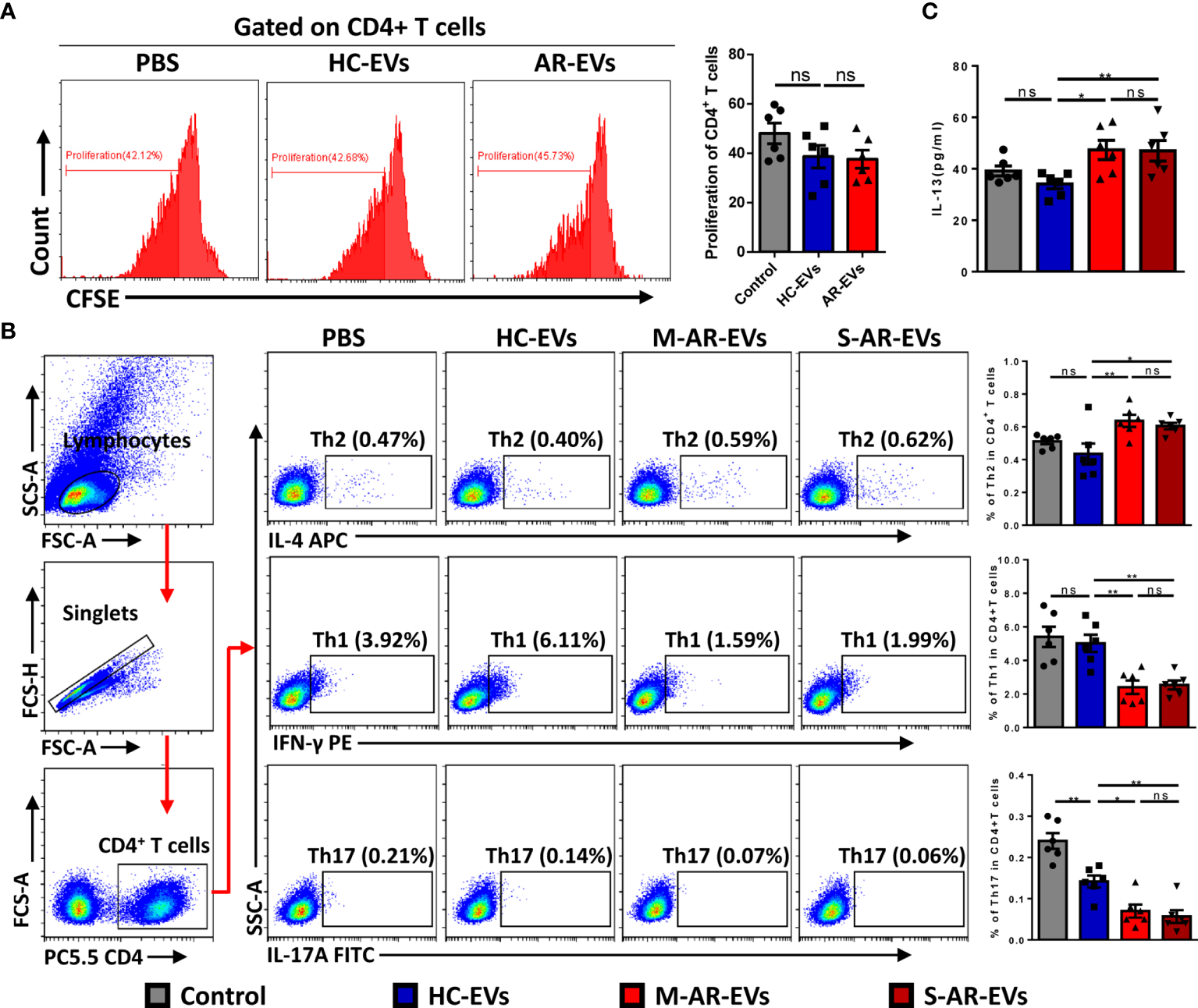 To confirm the role of plasma EVs in pathogenesis of AR, we further determined the effect of AR-EVs on differentiation of T helper cells. The FMO for flow cytometry analysis of Th1, Th2 and Th17 cells was shown in supplementary Figure S2. We observed no significant effects on the proliferation of CD4+ T cells treated with both HC-EVs and AR-EVs (Figure 5A). Interestingly, both M-AR-EVs and S-AR-EVs were able to significantly increase the level of Th2 cells in PBMCs compared to HC-EVs, and oppositely decrease the levels of Th1 and Th17 cells, as shown by flow cytometry analysis (p < 0.05, Figure 5B). Consistently, we also found that level of IL-13 in the supernatants was significantly increased by the treatment of M-AR-EVs (p < 0.05) and S-AR-EVs compared to HC-EVs (p < 0.01, Figure 5C).