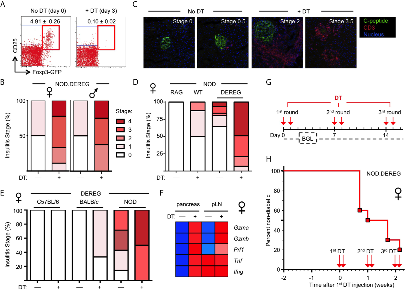 In summary, the NOD.DEREG line represents a novel tool to analyze the specific role of Foxp3+ Treg cells in the control of β cell autoimmunity, resolving some of the previous limitations of NOD mice with constitutive Foxp3 deficiency or transgenic expression of a diabetogenic TCR. This includes mechanistic studies on novel Treg cell-based therapies under experimental conditions of synchronized, advanced β cell autoimmunity.