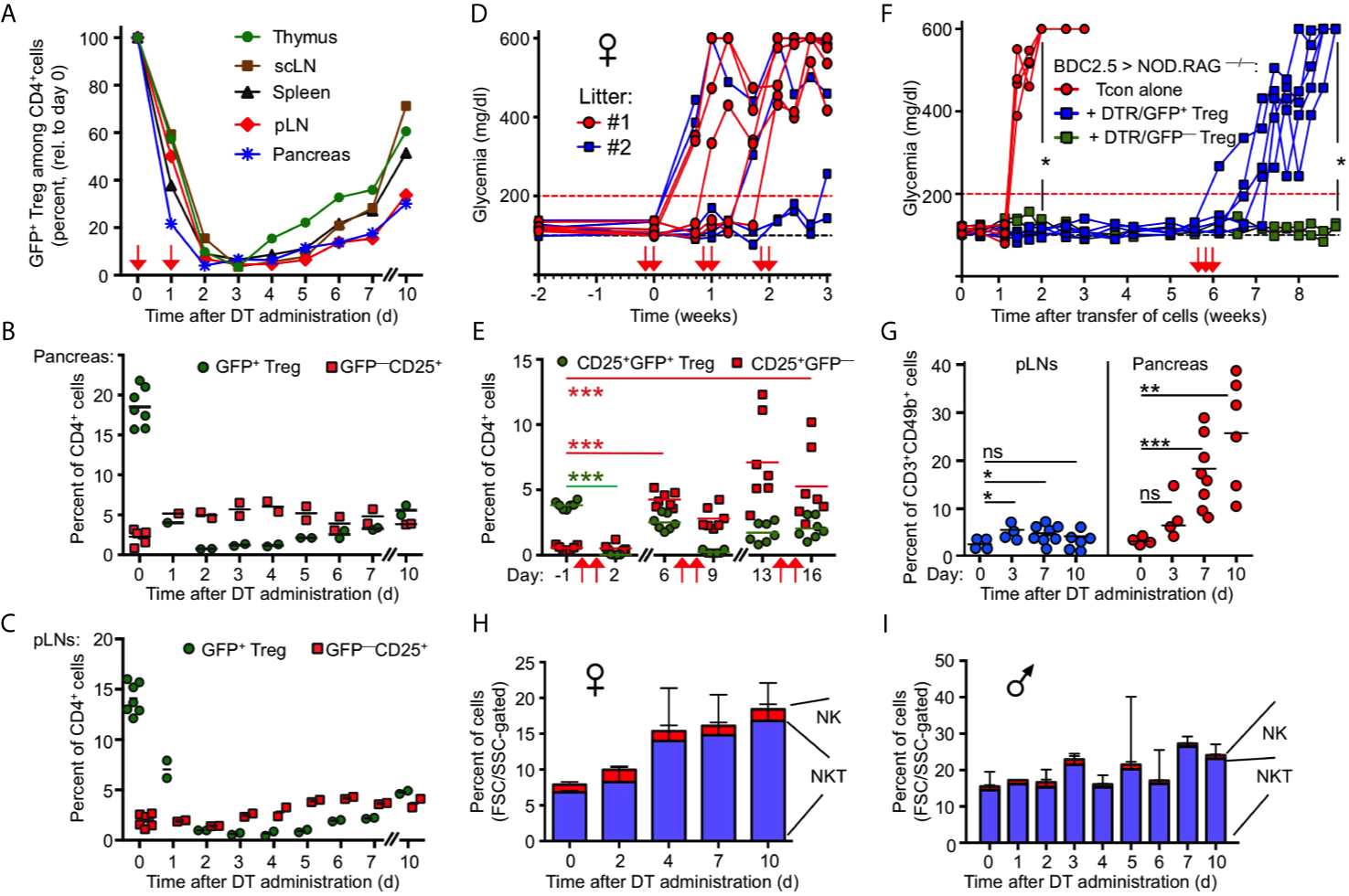 Transient nature of Treg cell ablation in NOD.DEREG mice. (A) Kinetics of DT-mediated ablation and subsequent recovery of the CD4+GFP+ Treg cell compartment in pancreas and indicated lymphoid organs of 10-12-week-old NOD.DEREG mice. Data are from a single experiment (2 mice/timepoint) representative of 3 experiments performed. Arrows indicate days of DT injection. (B, C) GFP+ Treg cell recovery in (B) pancreas and (C) pLN is preceded by the rapid accumulation of CD4+CD25+ cells lacking DTR/GFP expression (GFP–). Each symbol corresponds to an individual mouse (10-12-week-old). (D, E) Impact of repeated DT administration on glycemic state and Treg cell depletion. (D) Blood glucose concentrations of individual NOD.DEREG mice presented in Figure 1(H). Arrows indicate days of DT injection. (E) Kinetics of CD25+GFP+ and CD25+GFP– cells among CD4-gated cells, as revealed by flow cytometry among peripheral blood-derived CD4+ T cells at different timepoints (Two-way ANOVA in combination with Bonferroni’s Multiple Comparison post-test: ***p < 0.001). (F) Acute Treg cell ablation in the absence of Treg cell rebound. NOD.RAG1–/– mice were repopulated with diabetogenic BDC2.5 T conventional cells, either alone (red circles) or with GFP+ (blue squares) or DTR/GFP– (green squares) Treg cells, and blood glucose levels of recipients were routinely assessed at least twice a week for up to 9 weeks. DT was injected at three consecutive days of week 6 (arrows). (Mann-Whitney-U test; two weeks: p = 0.0159, nine weeks: p = 0.0476). (G–I) Pancreatic NKT cell accumulation after Treg cell ablation. (G) Percentages of CD3+CD49b+ NKT cells among FSC/SSC-gated cells in pLNs (left) and pancreas (right) of 12-16-week-old NOD.DEREG females before (day 0) and at indicated days after DT administration. Symbols and horizontal lines indicate individual mice (4-8 mice per timepoint) and mean values, respectively. Unpaired t-test: ns, not significant; *p ≤ 0.05, **p ≤ 0.01, ***p < 0.001). (H, I) Kinetics of pancreas-infiltrating CD3+CD49b+ NKT and CD3–CD49b+ NK cells (FSC/SSC-gated) in (H) female and (I) male NOD.DEREG mice (10-12-week-old). Shown are mean percentages ± SD (day 0: n = 7) or mean percentages and range of replicate mice (days 1-7, day 10: n = 2).