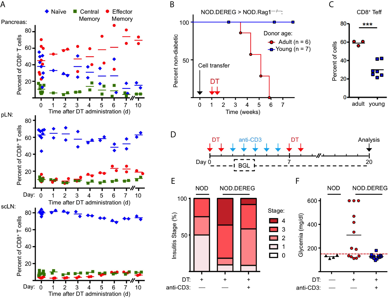 Anti-CD3 mAb therapy after Treg cell ablation ameliorates insulitis and prevents progression to hyperglycemia. (A) Kinetics of CD8+ T cells with a naïve (CD62LhighCD44low), central memory (CD62LintCD44int), and effector/memory (CD62LlowCD44high) phenotype in pancreas (top), pLN (middle), and scLN (bottom) of 10-12-week-old NOD.DEREG mice before (day 0) and at indicated days after DT administration. (B, C) Adoptive splenocyte transfer model. (B) Splenocytes from adult (16-18-week-old) but not young (4-5-week-old) DTR/GFP+ NOD.DEREG donors promote overt diabetes in NOD.RAG1–/– recipient mice after DT treatment. Black arrow indicates the day of splenocyte transfer (2 x 106 total cells), and red arrows indicate the days of DT administration. (Log-Rank (Mantel-Cox) test, p = 0.0097). (C) Proportions of CD8+ T cells with a CD62LlowCD44high effector/memory phenotype in the pLN of NOD.RAG1–/– recipients of splenocytes from young (red circles) or adult (blue squares) NOD.DEREG donors. Unpaired t-test: ***p < 0.001. (D–F) anti-CD3 mAb treatment of Treg cell-depleted NOD.DEREG mice. (D) Scheme of experimental design. Cohorts of adult NOD.DEREG females were injected with DT only (n = 13), or were additionally treated with anti-CD3 mAb (n = 13). Untreated DTR/GFP– NOD.DEREG mice were included for comparison (n = 4). Arrows: red, DT injection; blue, anti-CD3 injection; black, analysis by histology and flow cytometry. Blood glucose concentrations were assessed before (day 0) and every second day after the first injection with DT until the end of the observation period on day 14. (E) Histological insulitis score of indicated experimental groups, and (F) blood glucose levels of individual mice (one-way ANOVA: p ≤ 0.01). Each symbol in (A, C, F) corresponds to an individual mouse.