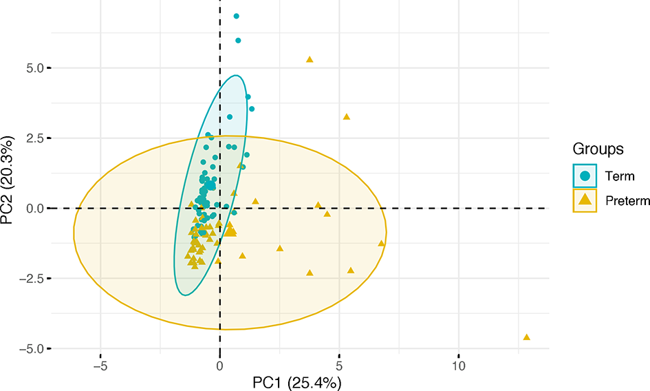 Projection of individual cord blood inflammatory profiles onto the first two principal components, grouped by gestational age category. Term infants are represented in green and preterm infants in gold, with ellipses modelled on the mean and covariances of each group.